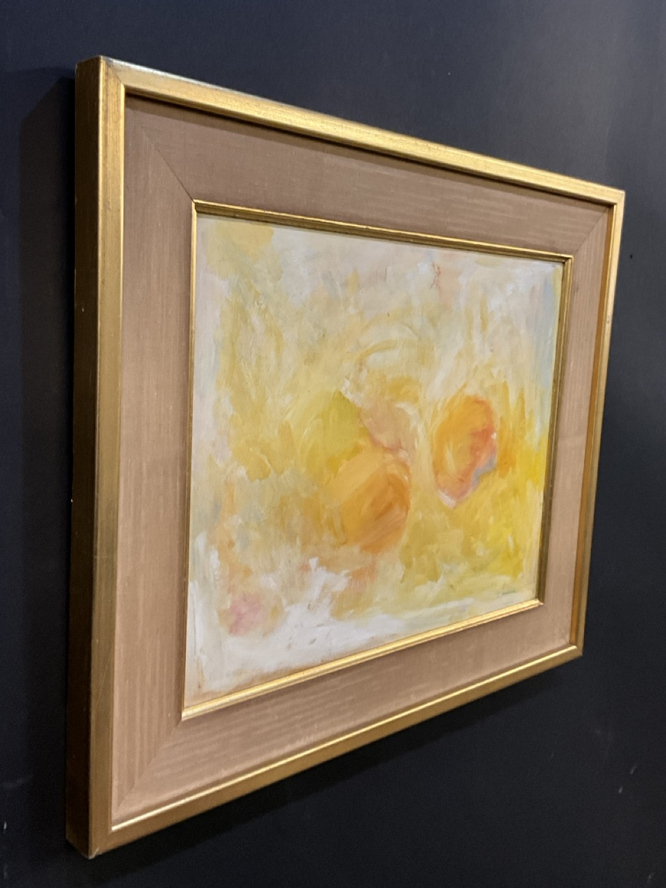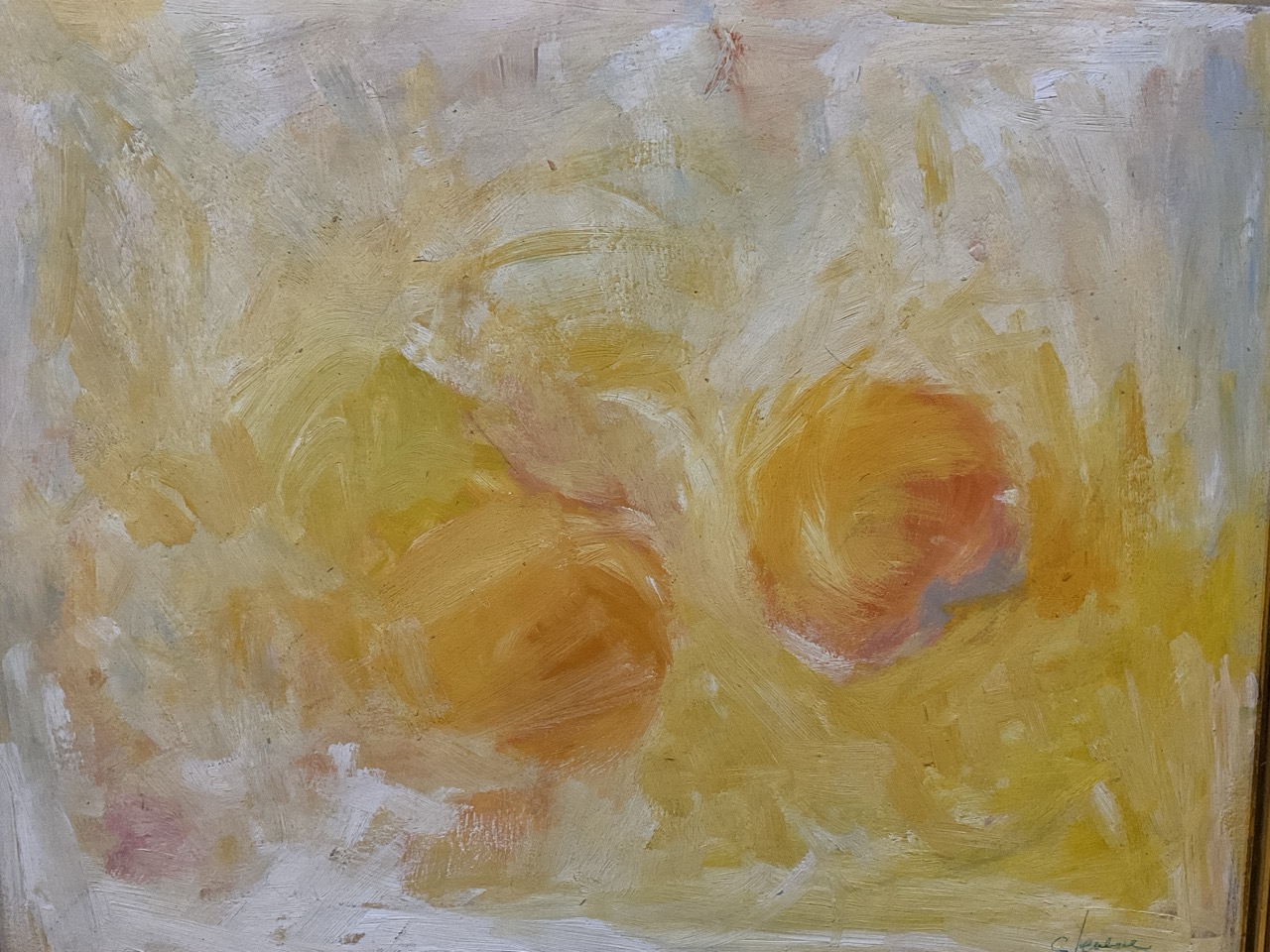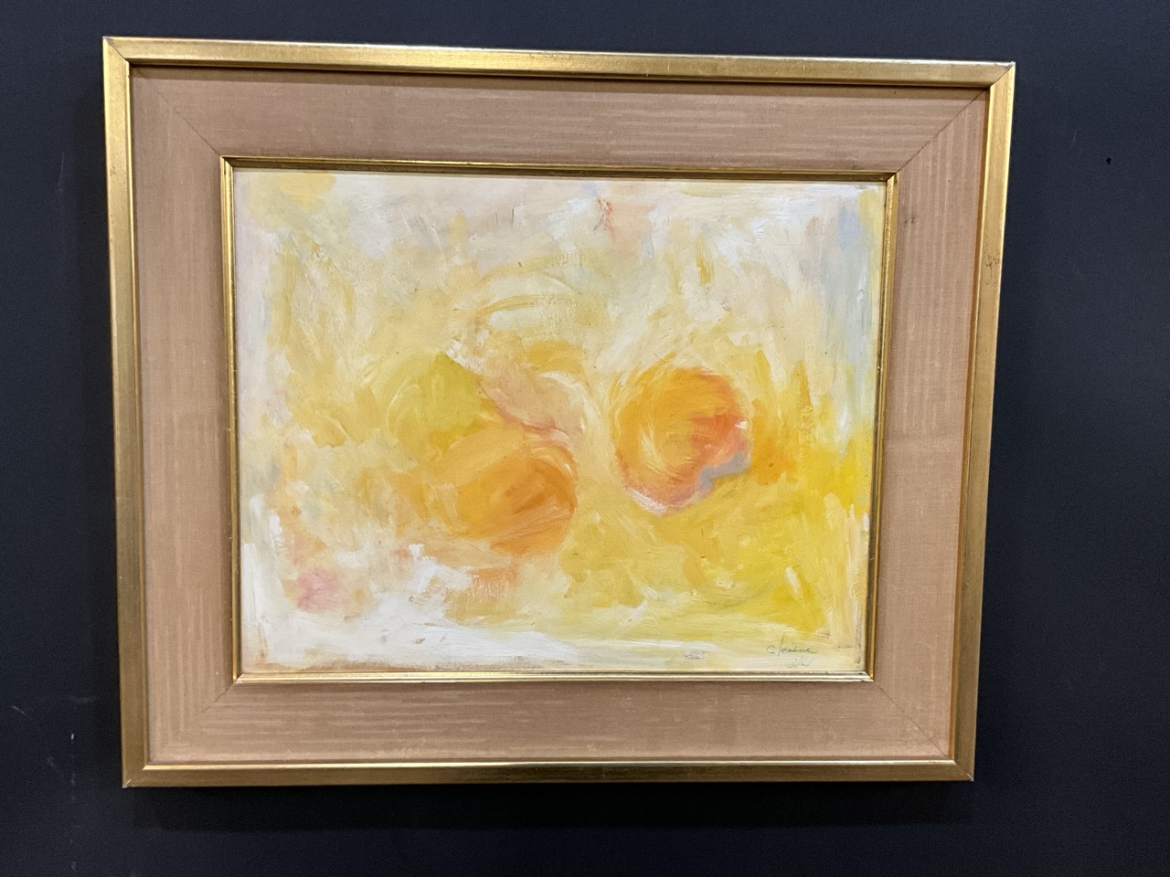 Mid Century Modern period Double Fire Ball Sun Abstract Oil Painting Signed Illegibly.