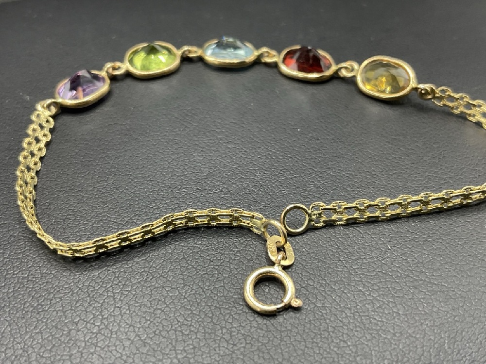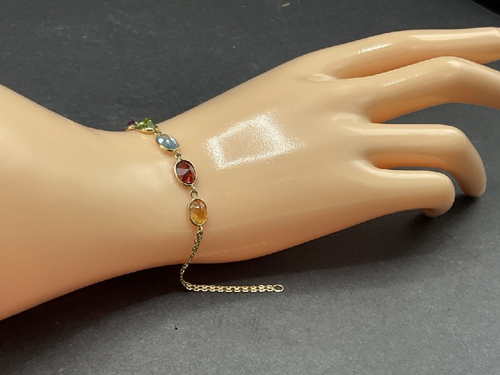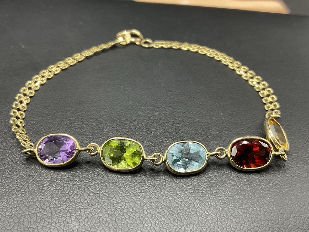 14K Yellow Gold Gemstone Bracelet. Peridot, Amethyst, Blue Topaz, Citrine and Garnet Stones.