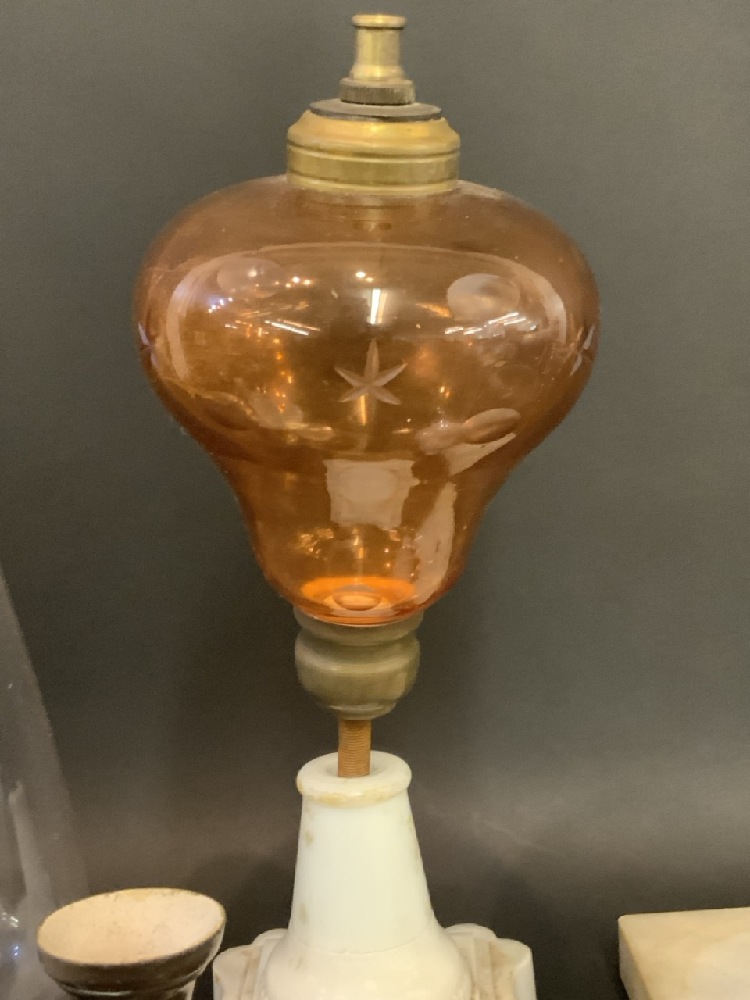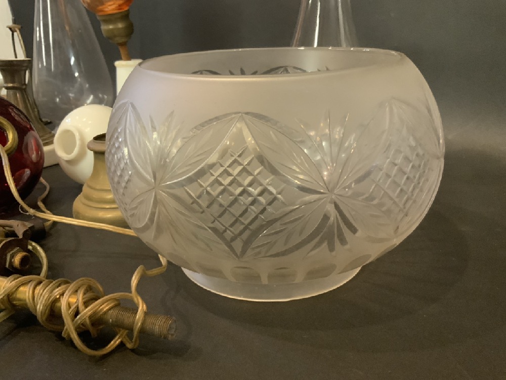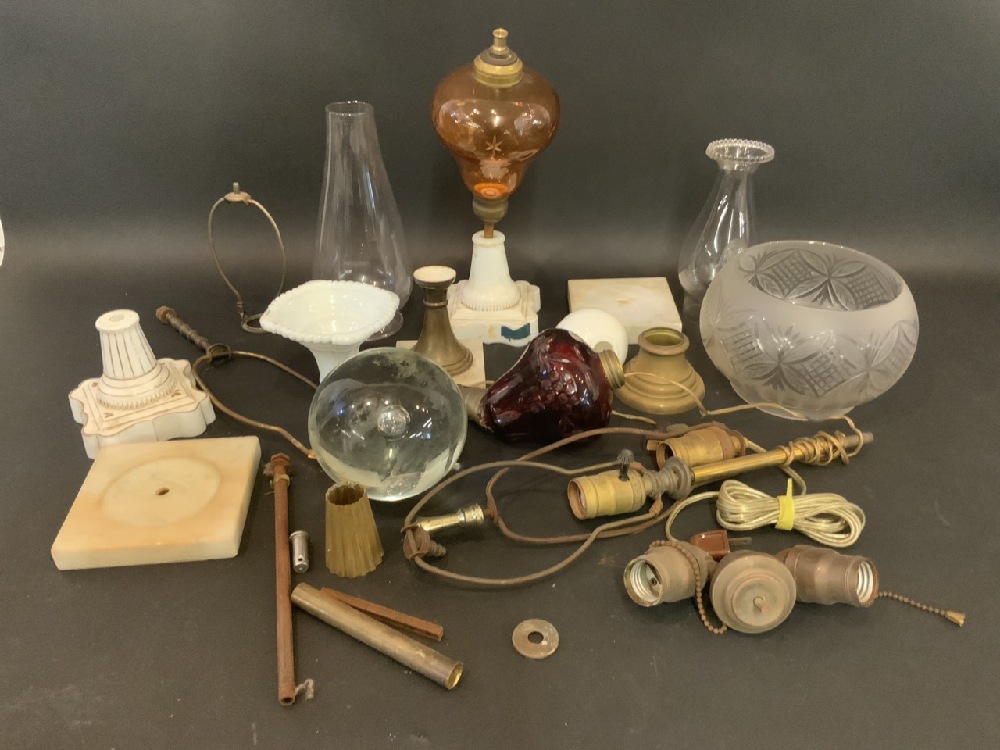Estate Compiled Grouping of Oil Lamp Parts. Early Sandwich glass bases, hardware, shades etc. As seen in photograph preview.