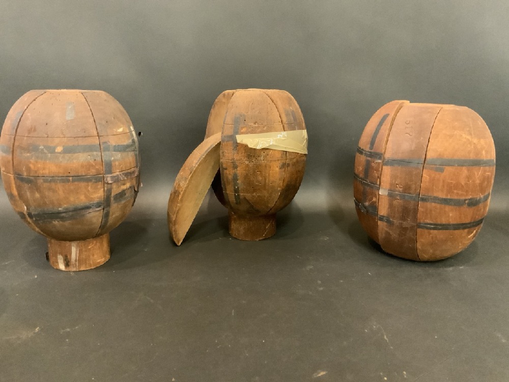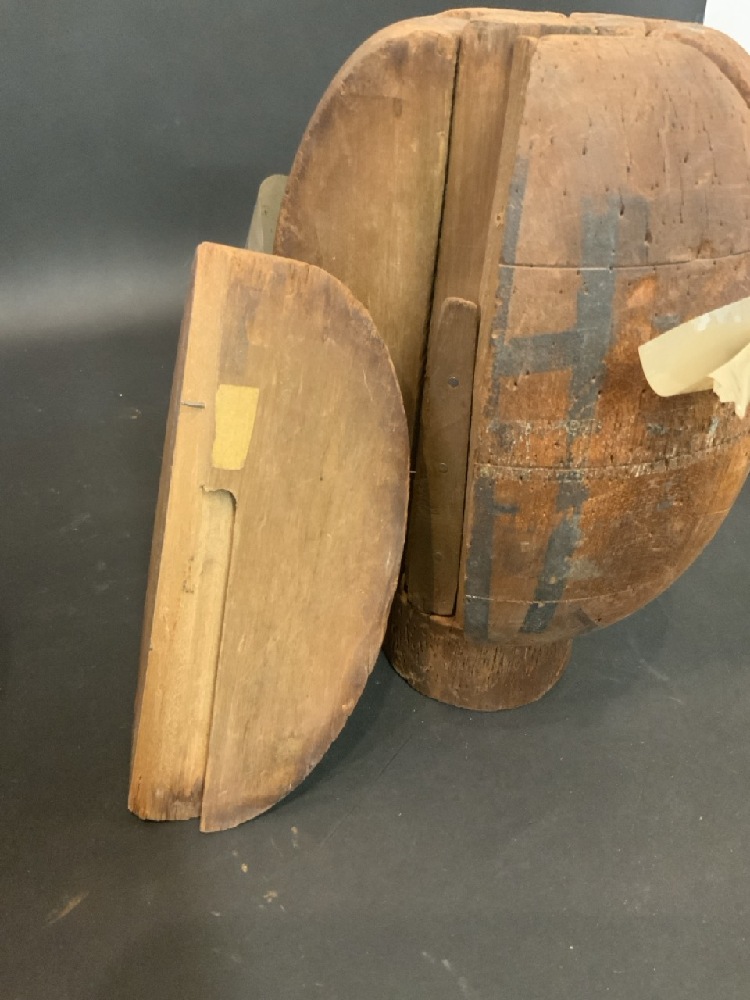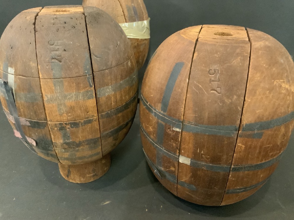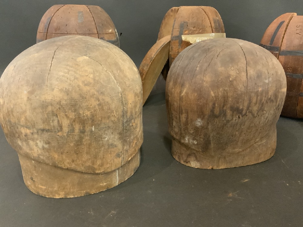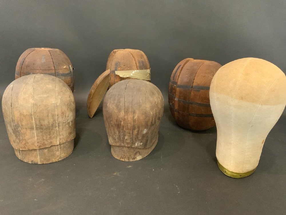 Six (6) Antique Wooden Hat Molds. Five for production one wrapped in cloth for display.