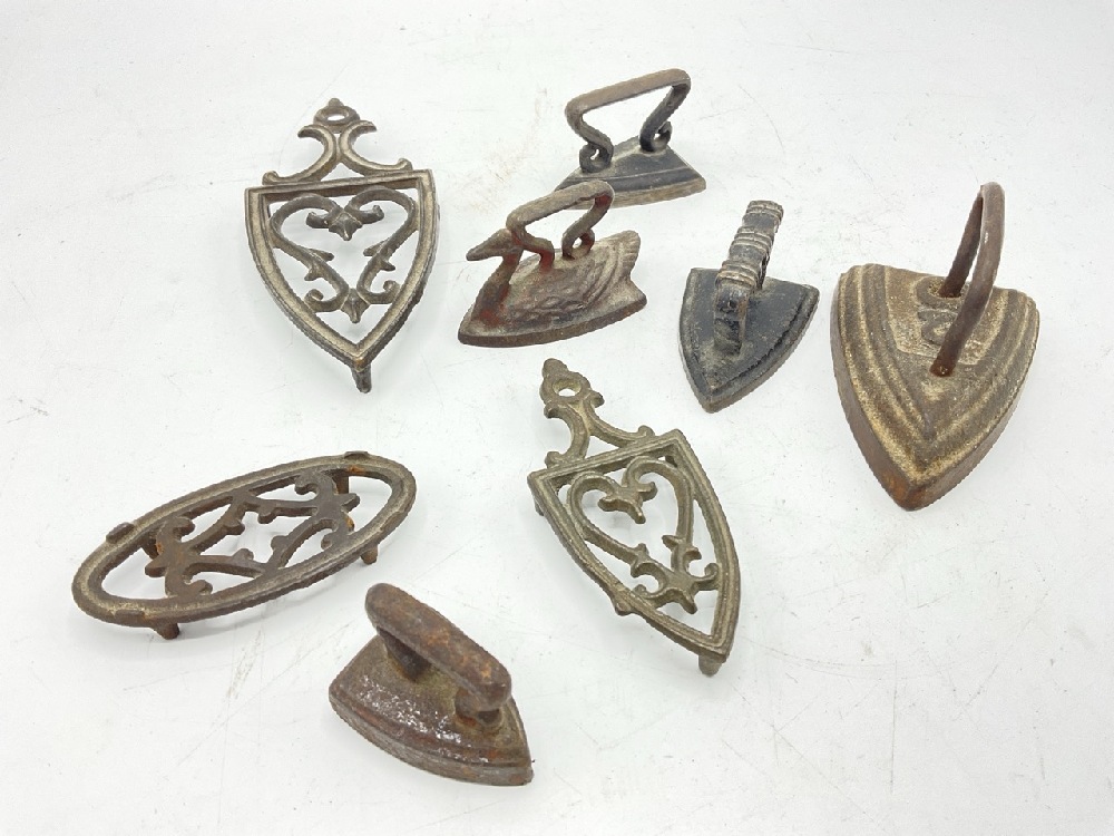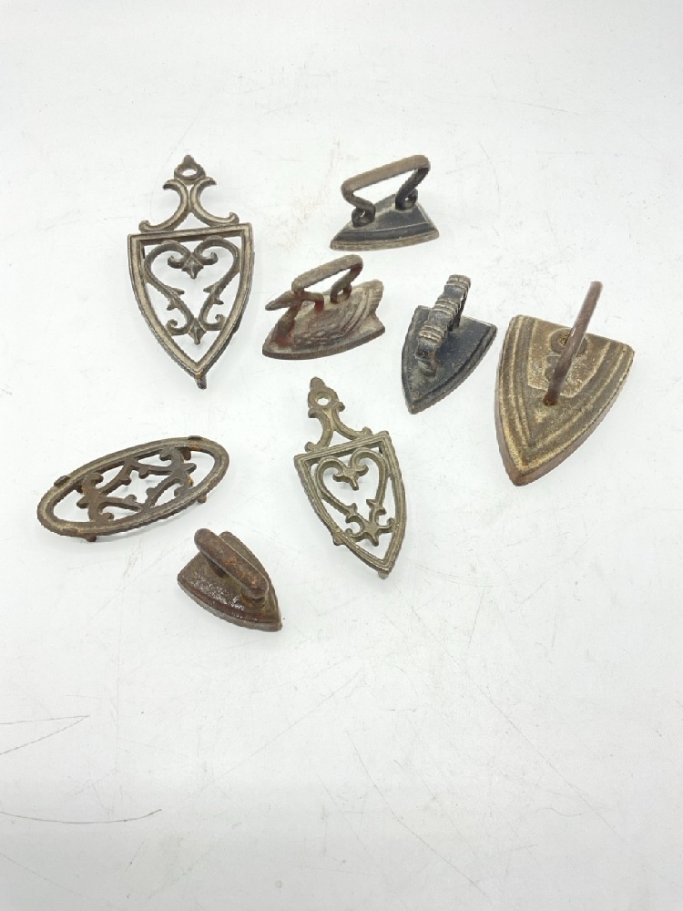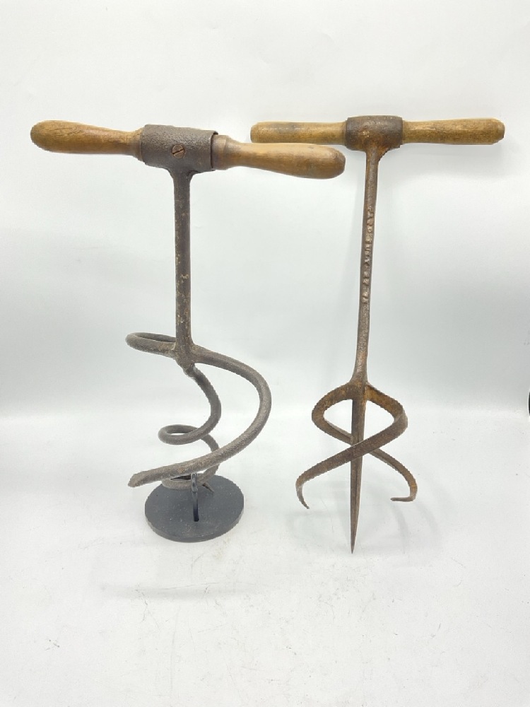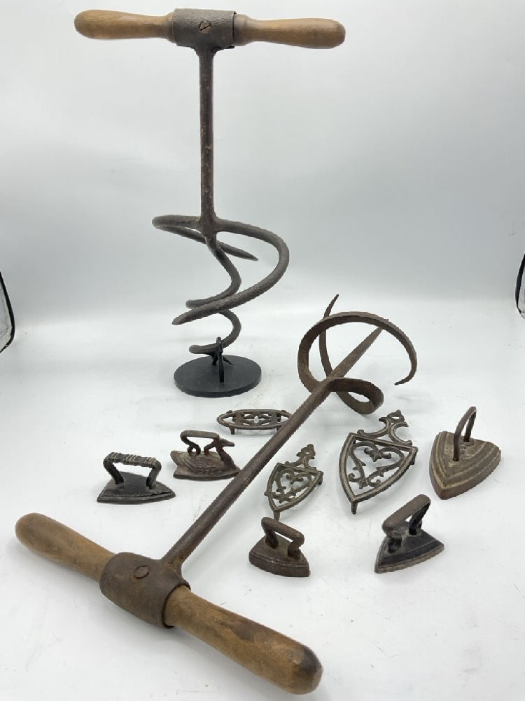 Antique Sugar Devil Auger Tools along with small collection of miniature irons.