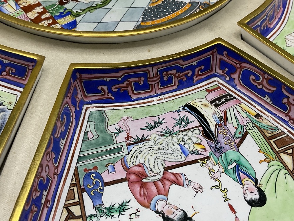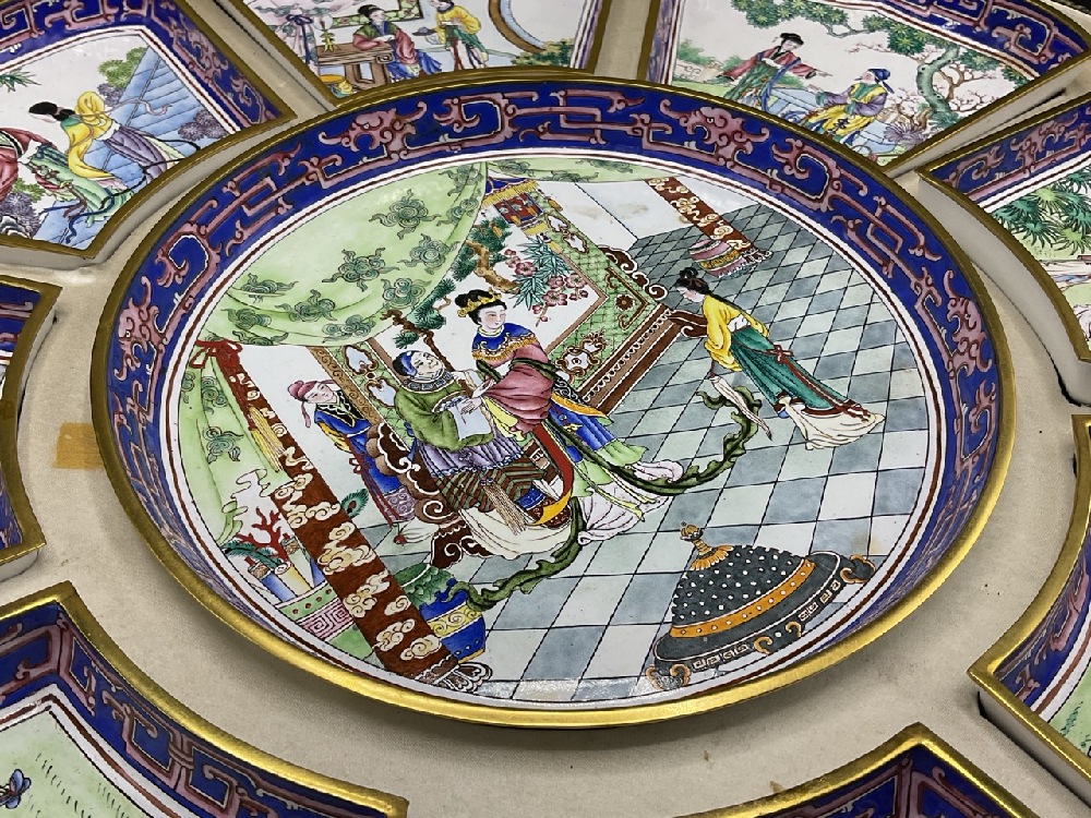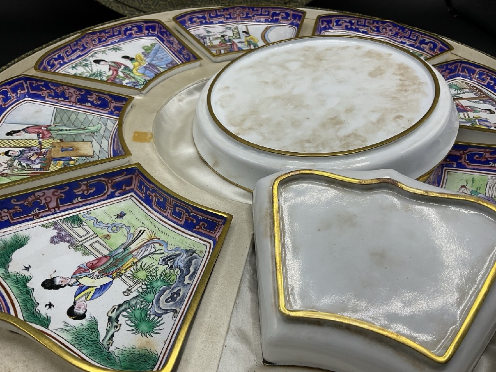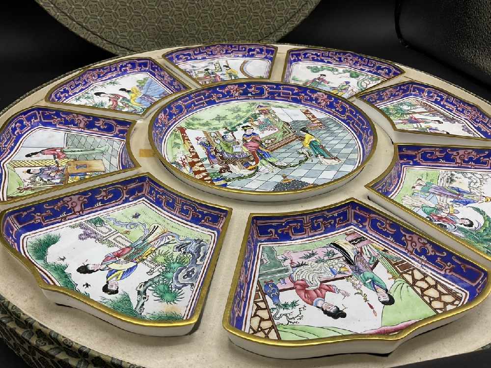 Chinese enameled supper set. Eight Side trays surrounded main round tray. Brass or copper with enameling. Comes with original box.