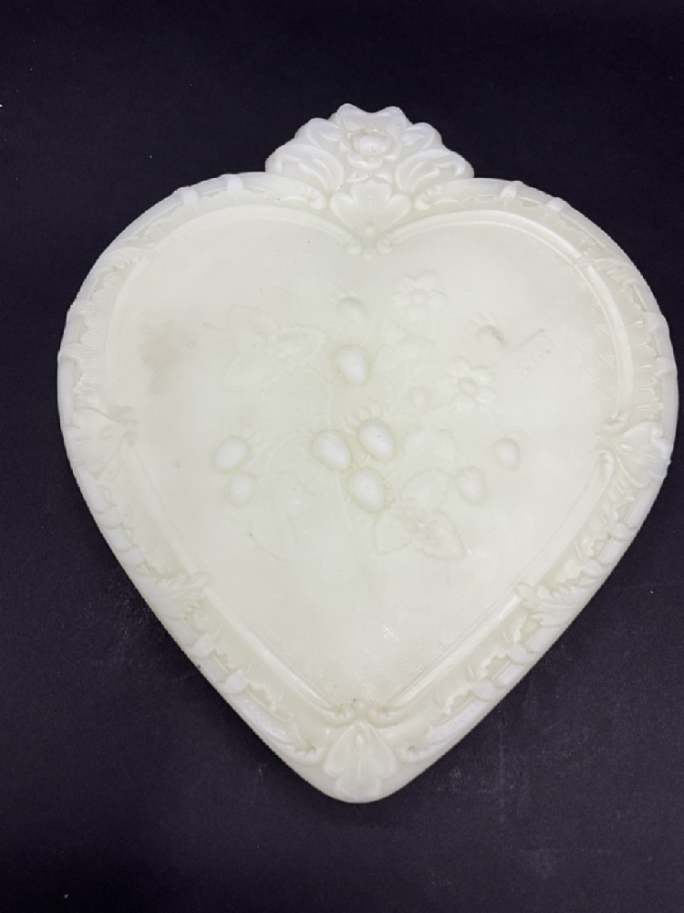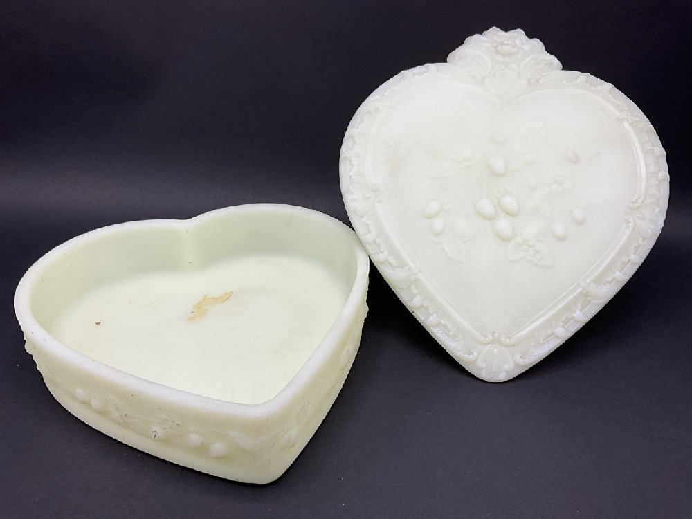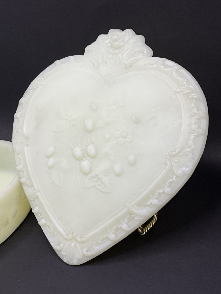 Antique Fenton Custard Uranium Glass Heart Shaped Trinket Box w/ Wild Strawberries.