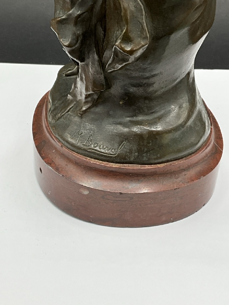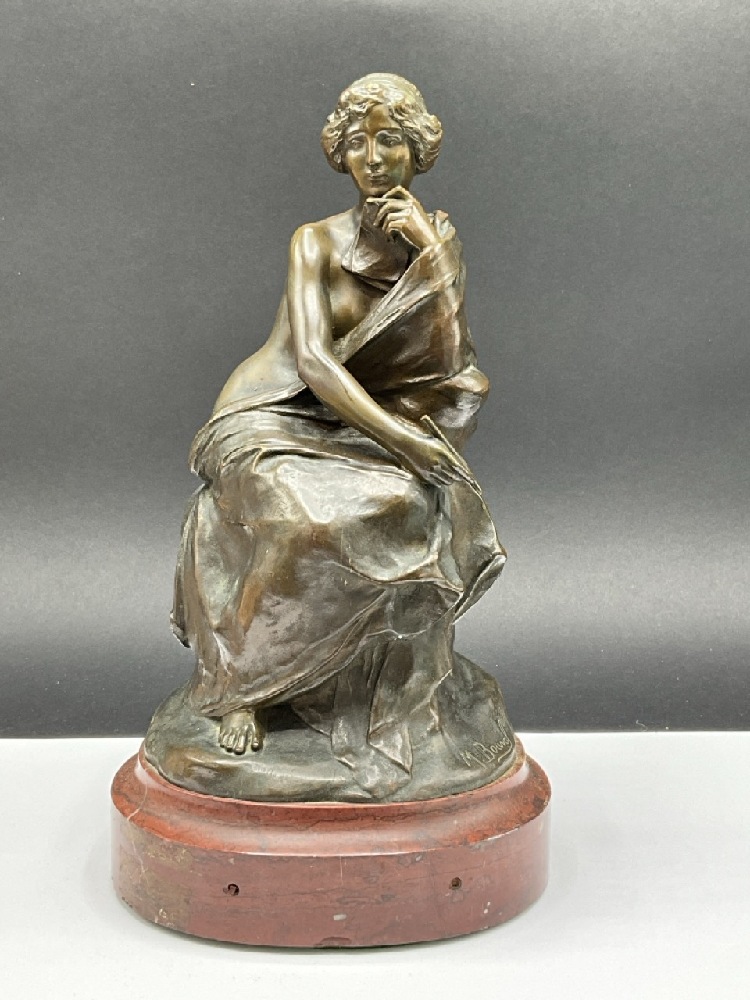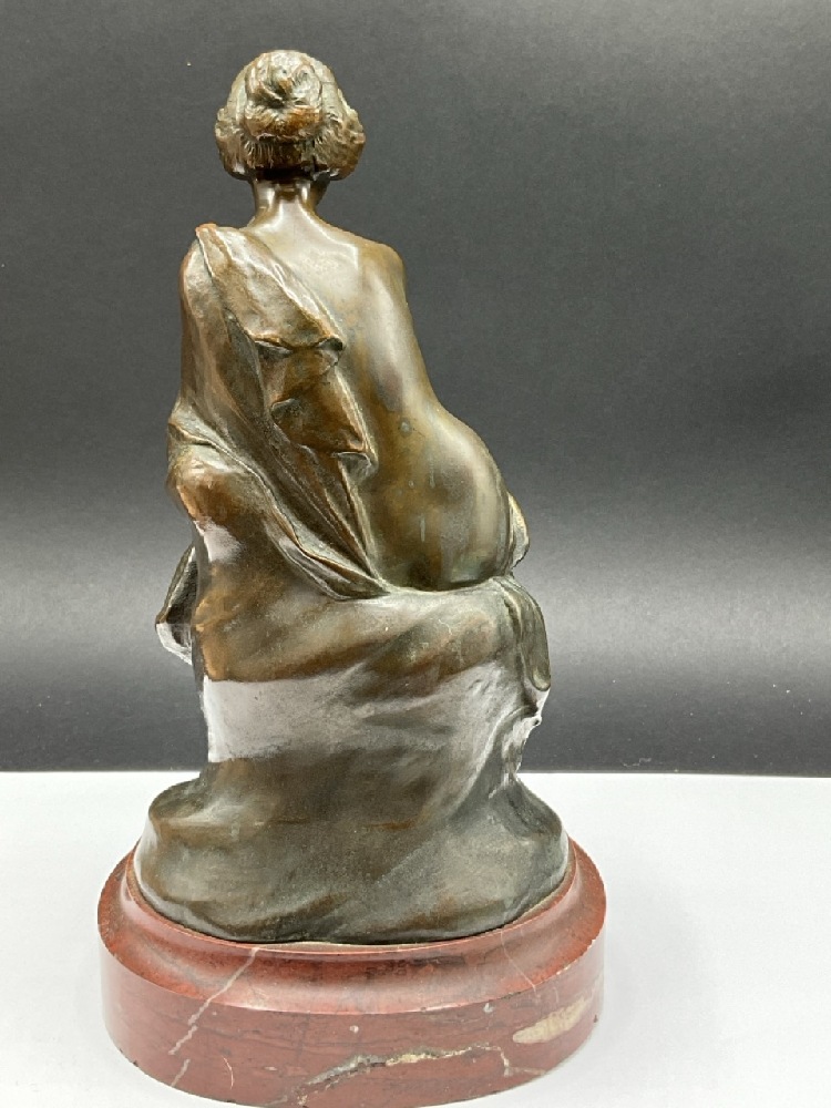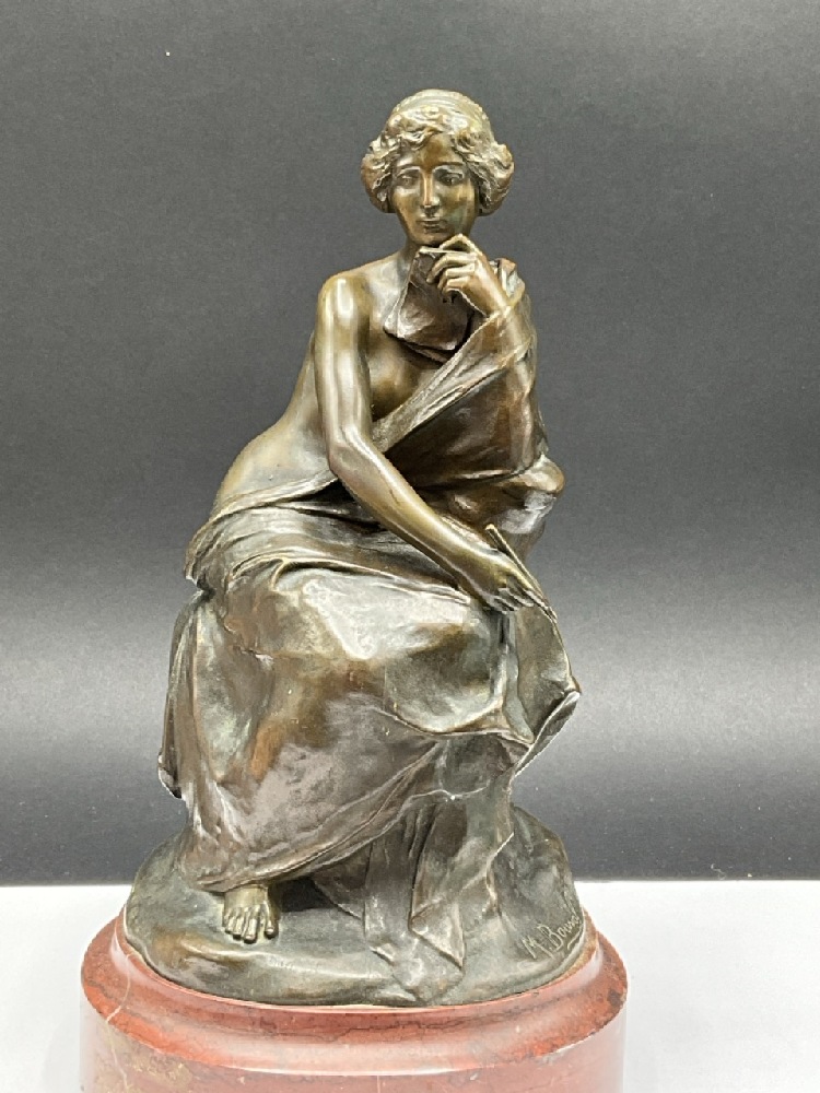 Bronze Femme Writer or Author with Red Marble Base. Excellent detail and patina. Late 19th or Early 20th century Production.