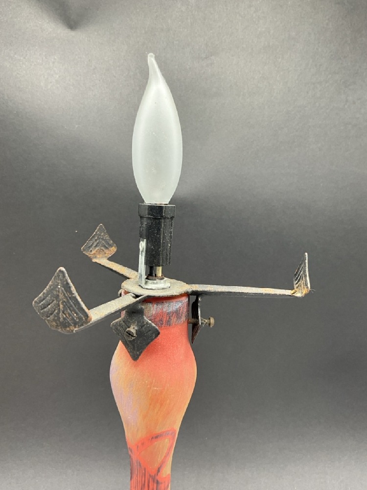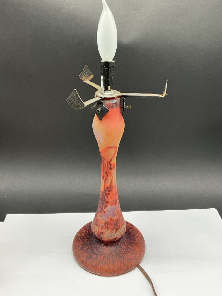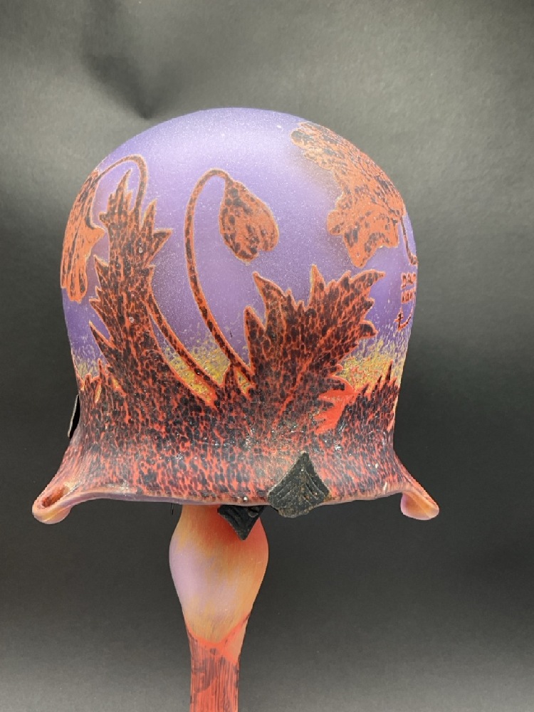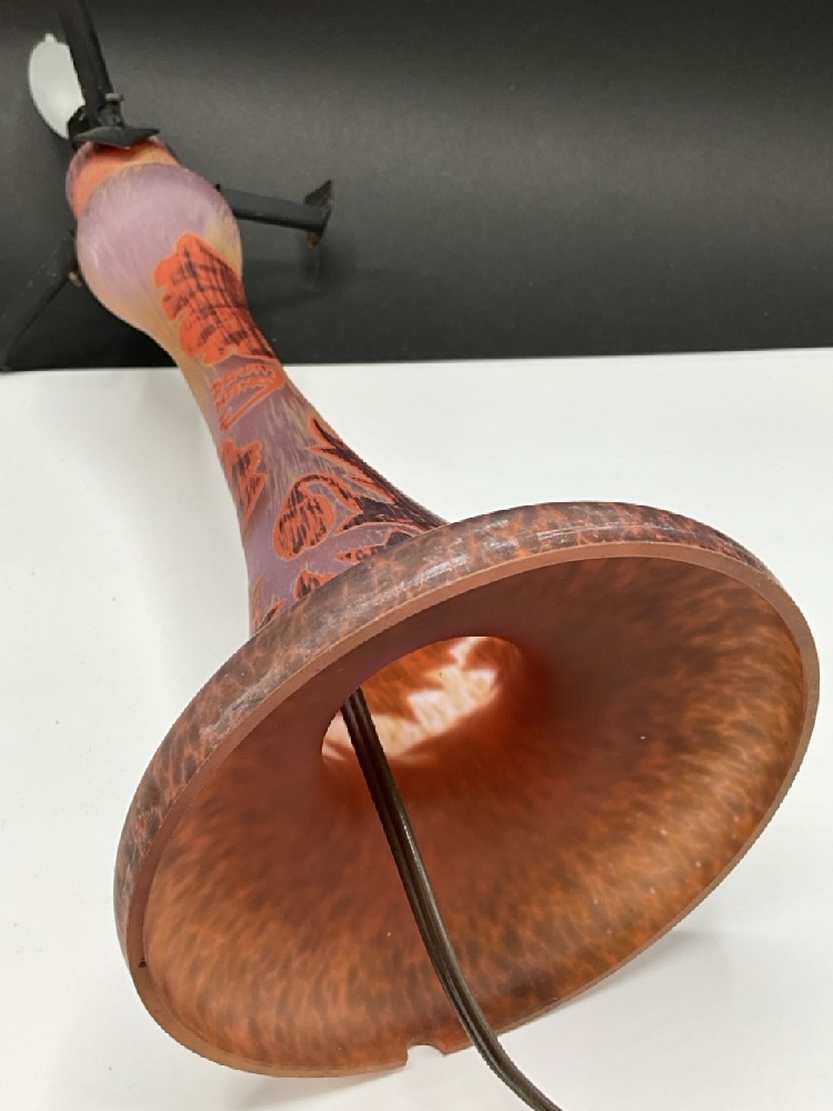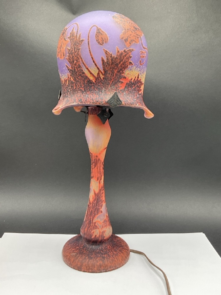 c. 1920's. Rich purple to pink coloring. The lamp shade in the form of a flapper style hat. Near mint condition with age consistent minor rubs or scratches. No repairs or restoration. Signed on base and shade.