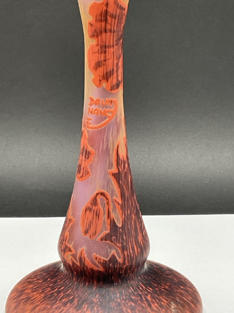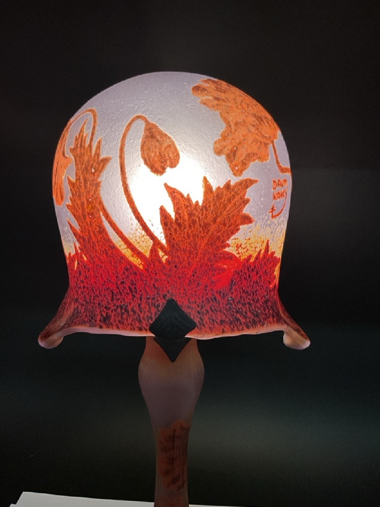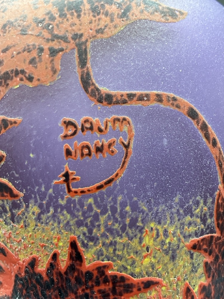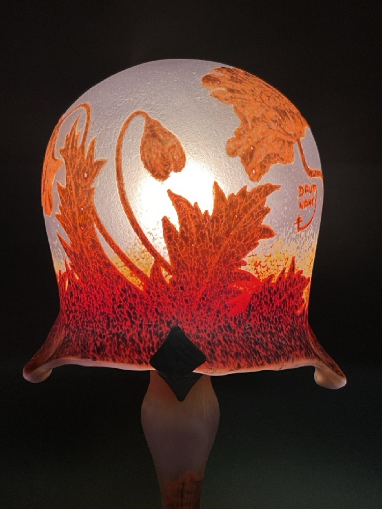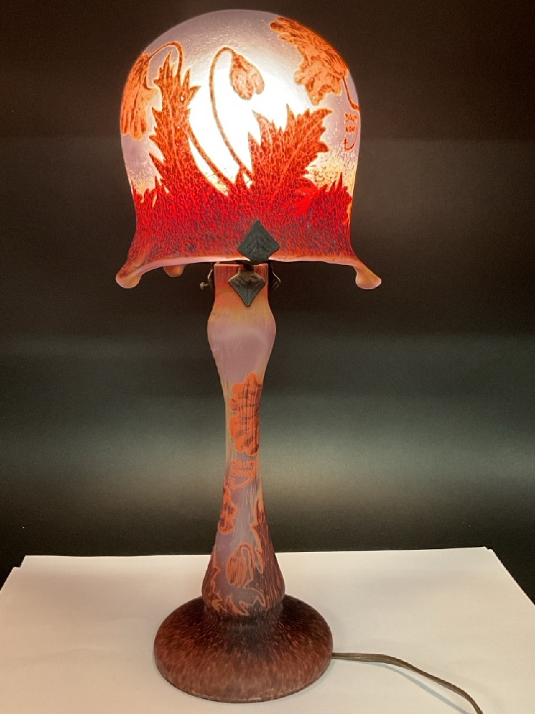 c. 1920's. Rich purple to pink coloring. The lamp shade in the form of a flapper style hat. Near mint condition with age consistent minor rubs or scratches. No repairs or restoration. Signed on base and shade.