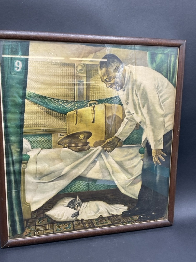 Rare Original Chessie Cat Print from the 1930's or 40's featuring the Stowaway Chessie Cat in the Air Conditioned Railroad Car with Black American Conductor. This is not a reproduction. Housed in Original Frame.