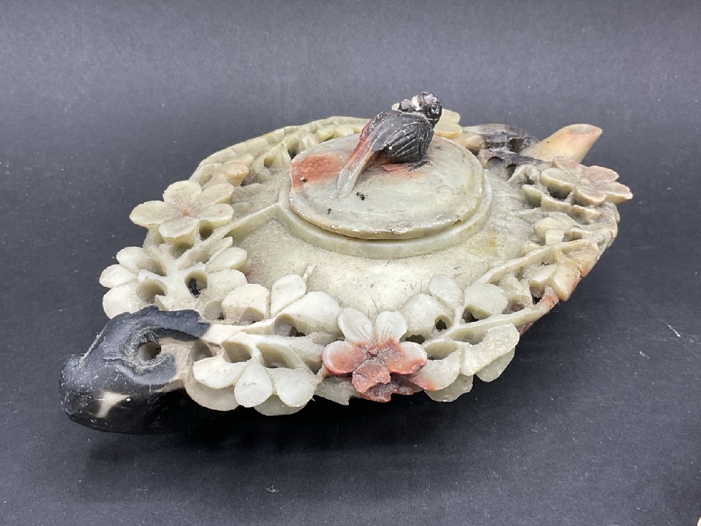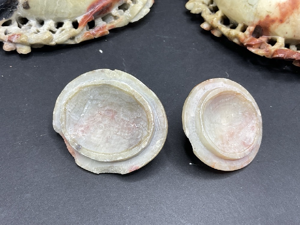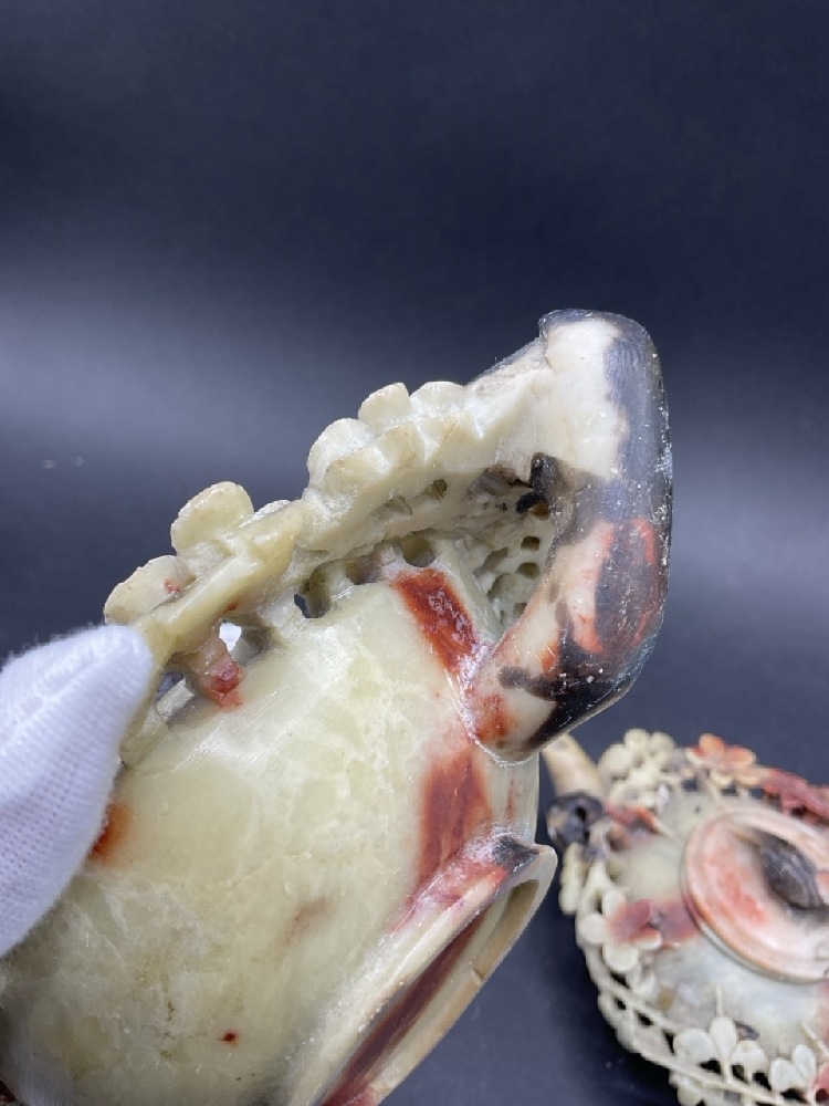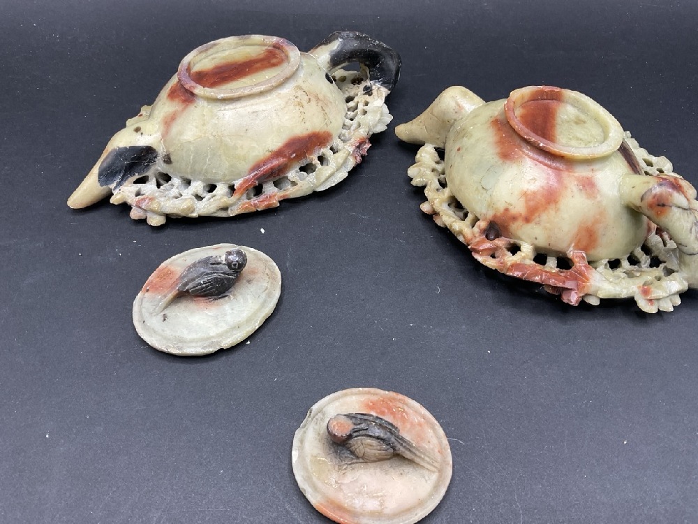 A Pair Carved Soapstone Teapots. Both lids are damaged. Nice organic form, circa 1920's. Please see photograph preview. Dimensions: 1 1/2” x 6 1/2”