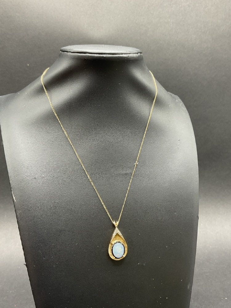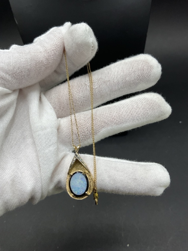 14K Yellow Gold Opal and Diamond Pendant Necklace.
