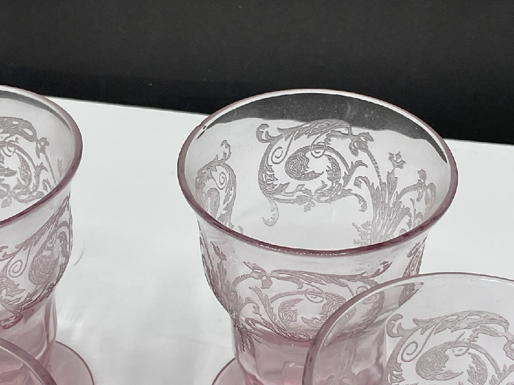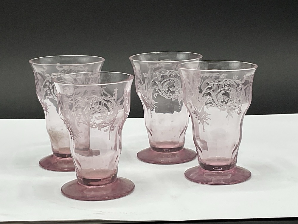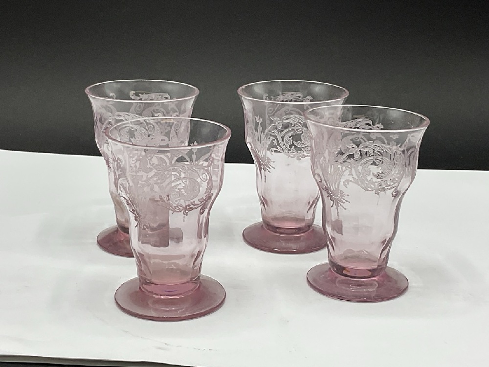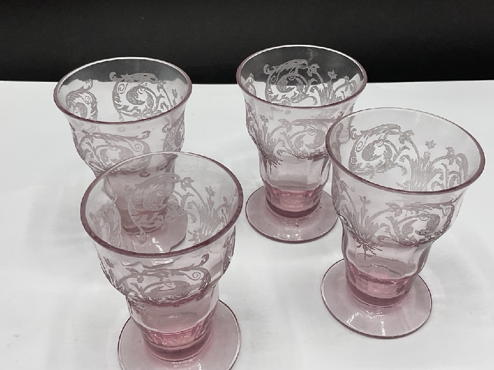 Four (4) Elegant Central Glass Works Footed Tumbler Juice Glasses. Amethyst Color.