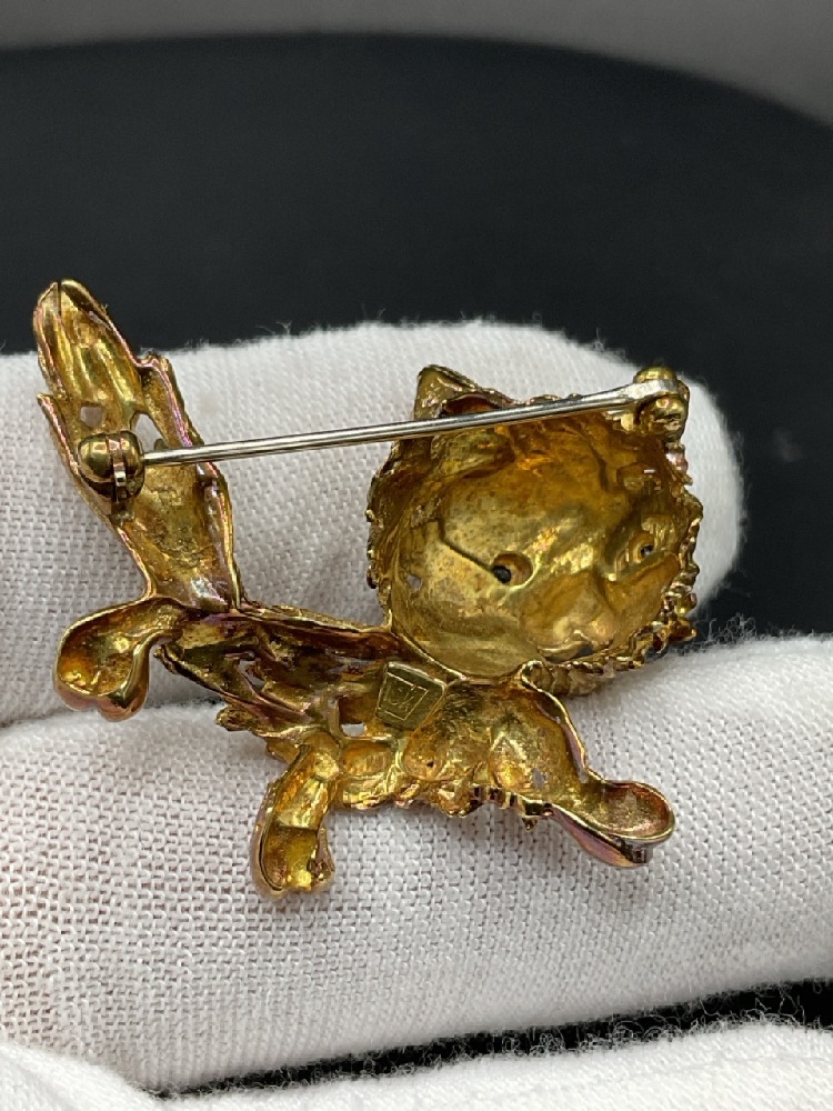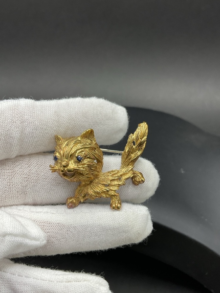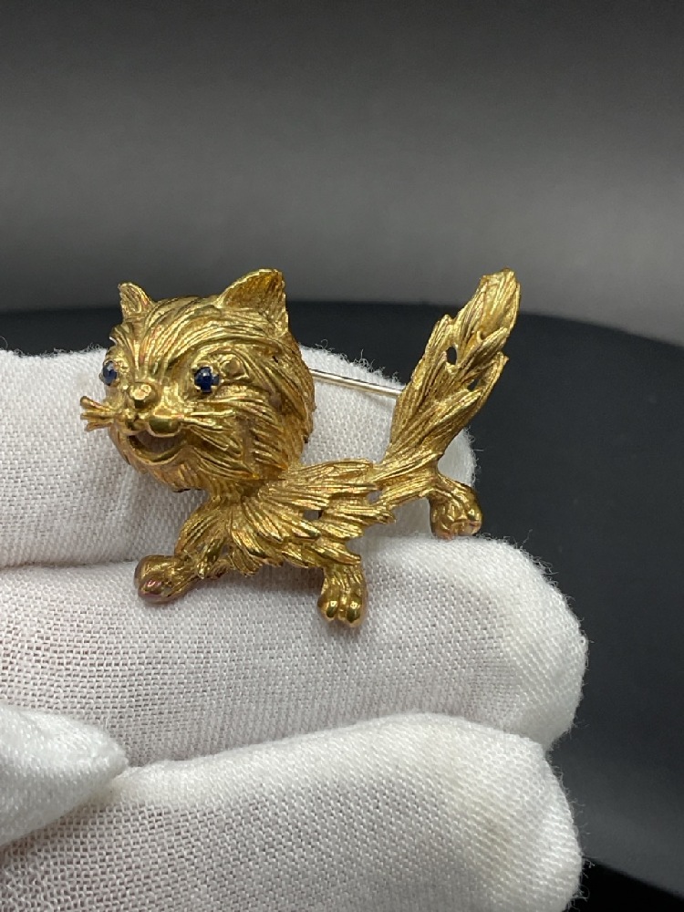 18K Yellow Gold Cat Brooch Pin w/ Blue Sapphire Eyes.