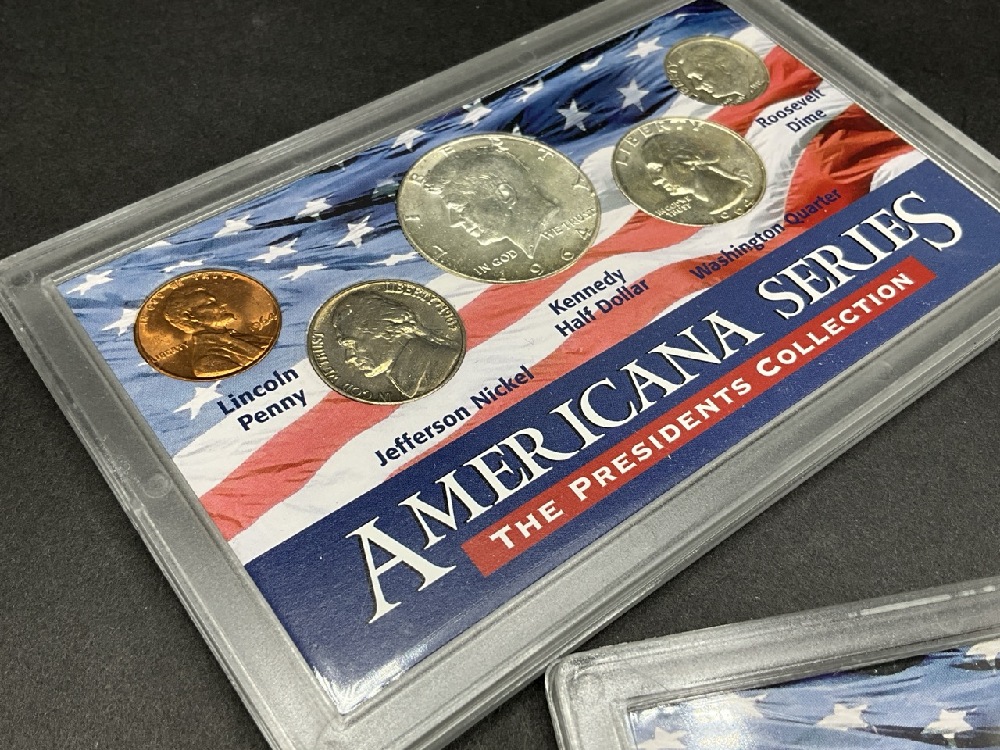 Three (3) Americana U.S Coin Sets Presidents Collection. Including Silver Dollars, Dimes, Halves etc.