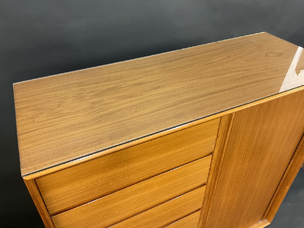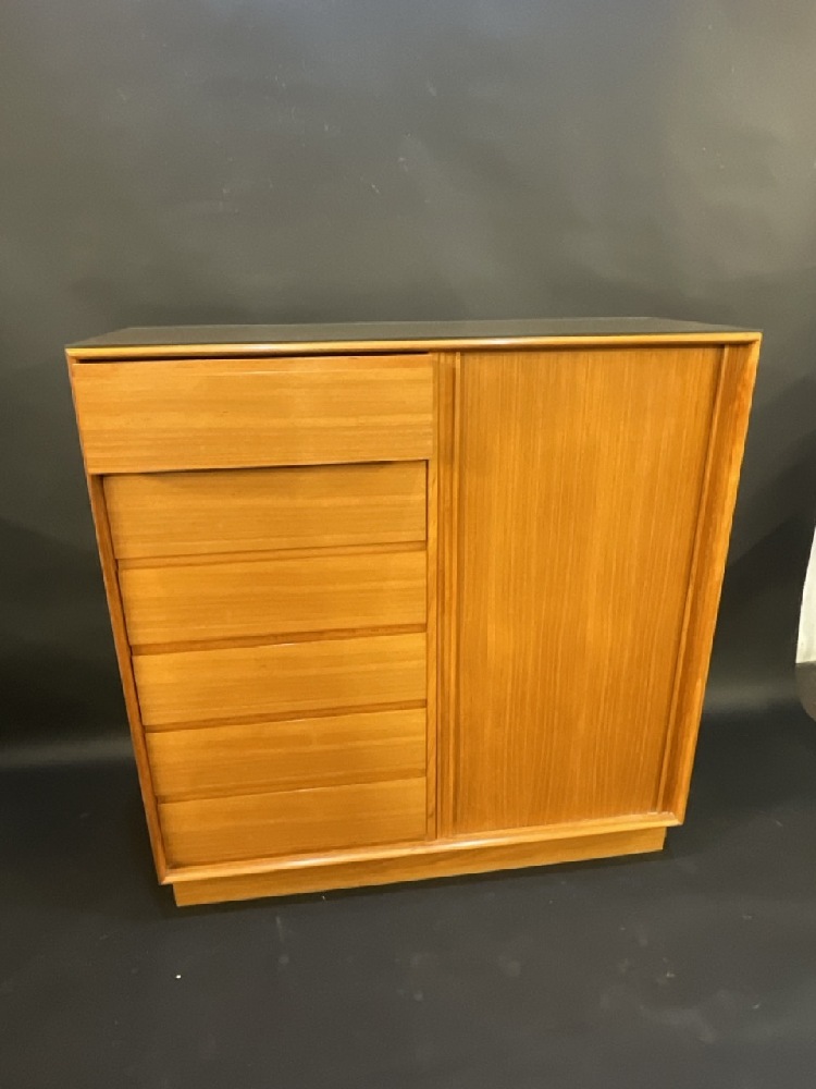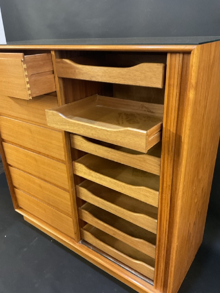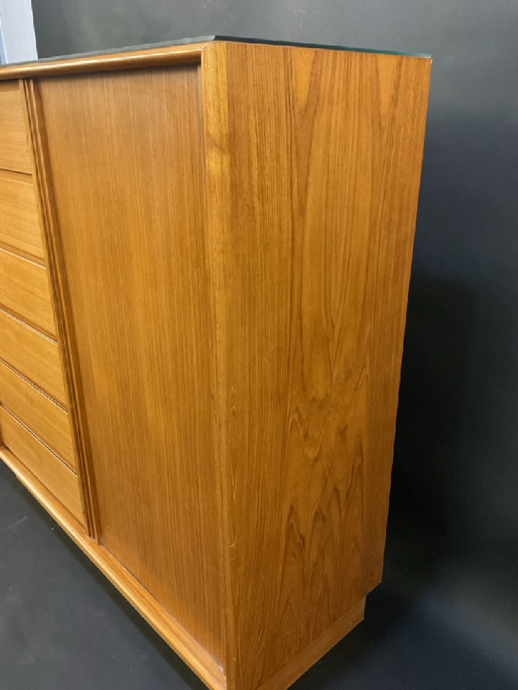 Danish Mid Century Modern Danflex Stystems Bureau High Chest. Chifferobe style with side door opening to pull out drawers. Very good condition. Comes with original glass top (optional for shipment).