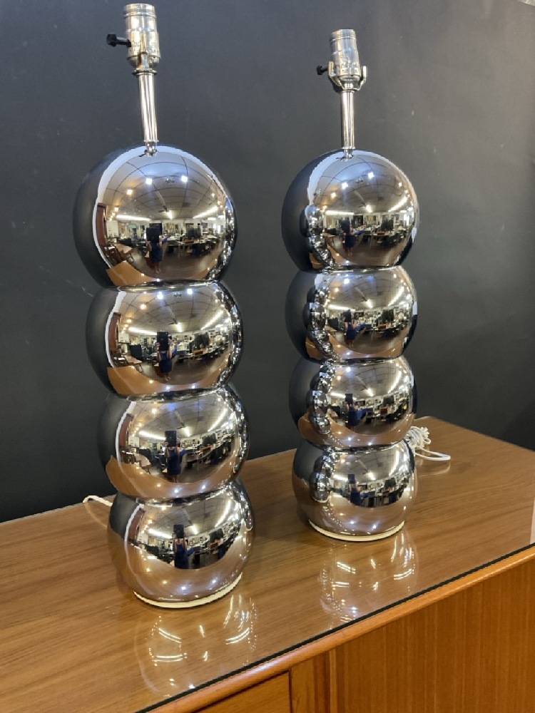 A Pair, George Kovacs Stacked Chrome Ball Table Lamps. Unsigned. c. 1970's. One socket for light bulb is loose. Overall good condition with wear consistent to age. Please see photograph preview.