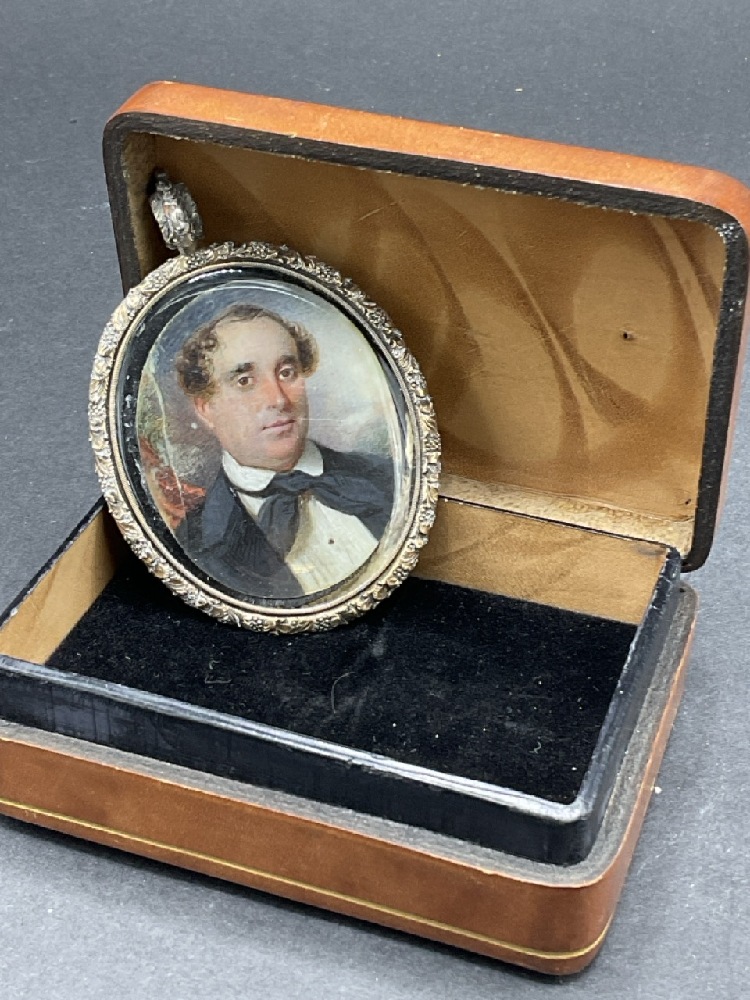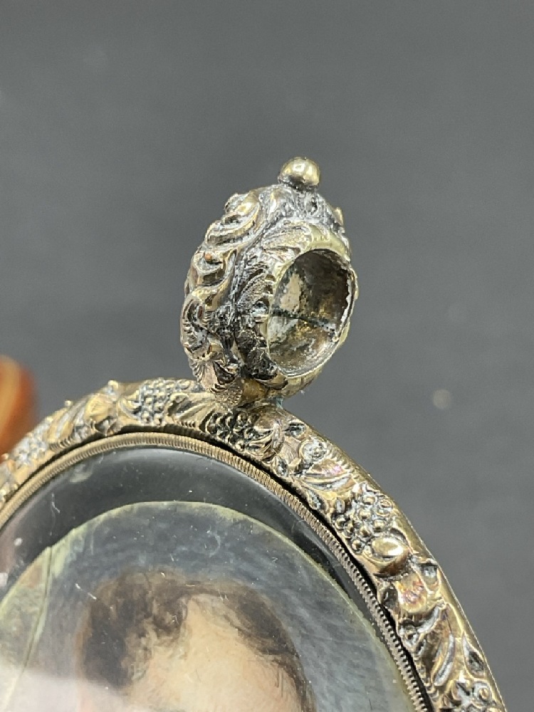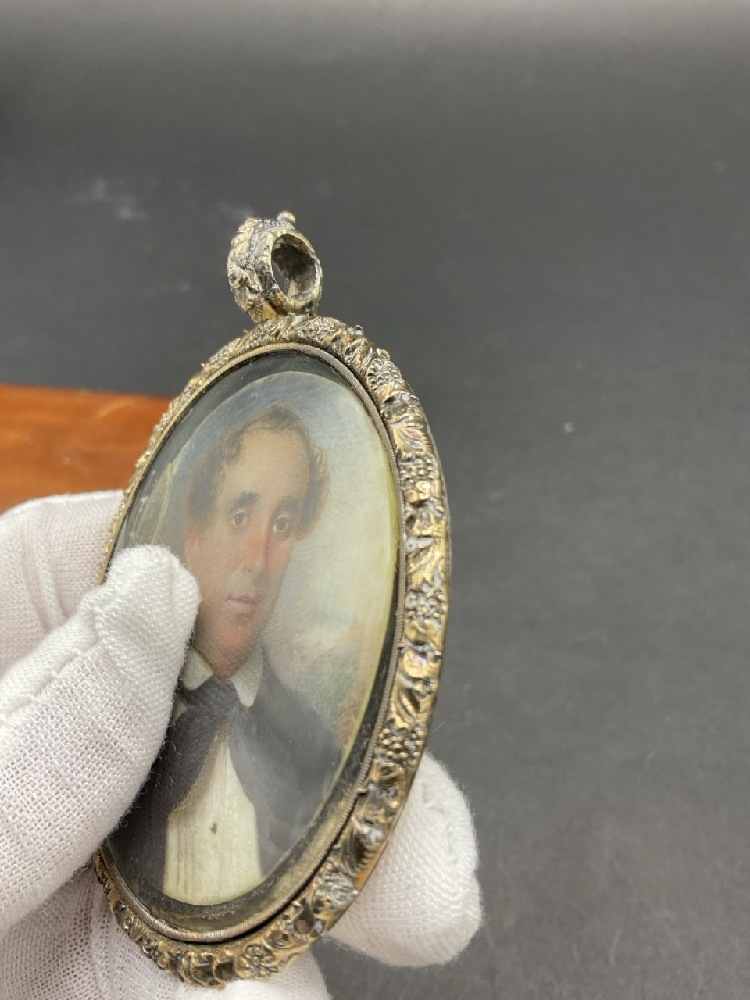 A 14K White Gold and Sterling Silver Miniature Portrait Frame. Locket filled with human hair inset on reverse. Unknown if portrait is original. Mounts and borders test for 14K gold and back plate tests silver.