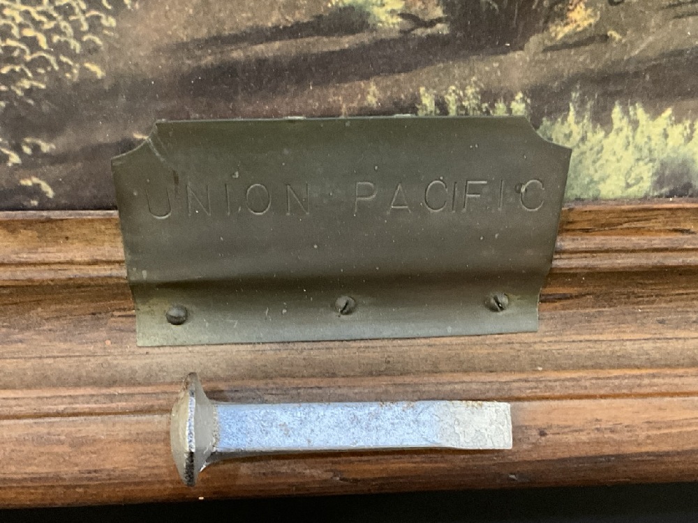 Union Pacific Railroad Advertising Print. Decorative Frame with Applied Railroad Spikes.