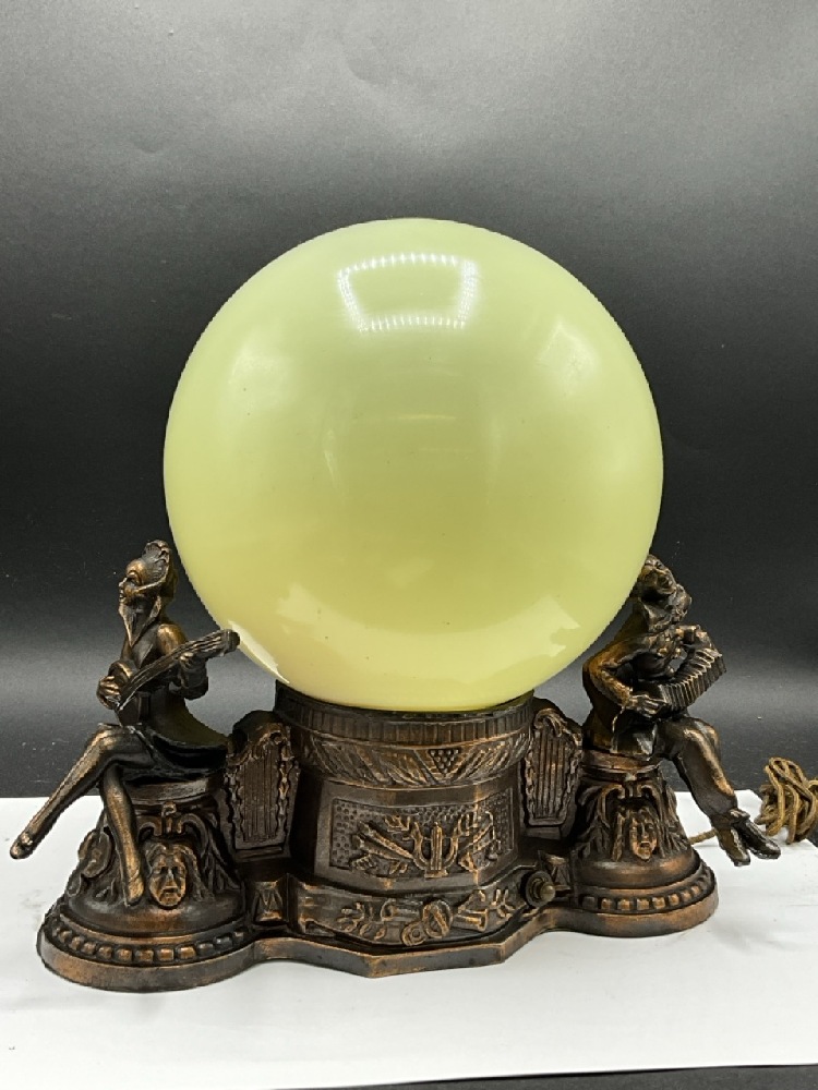 Vintage Jester and Musican Table Lamp w/Globe Shade. Rewiring needed. Please see photograph preview.