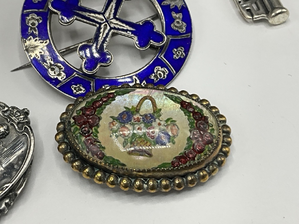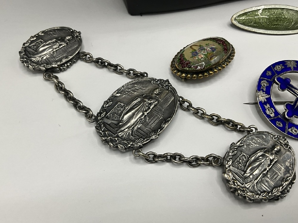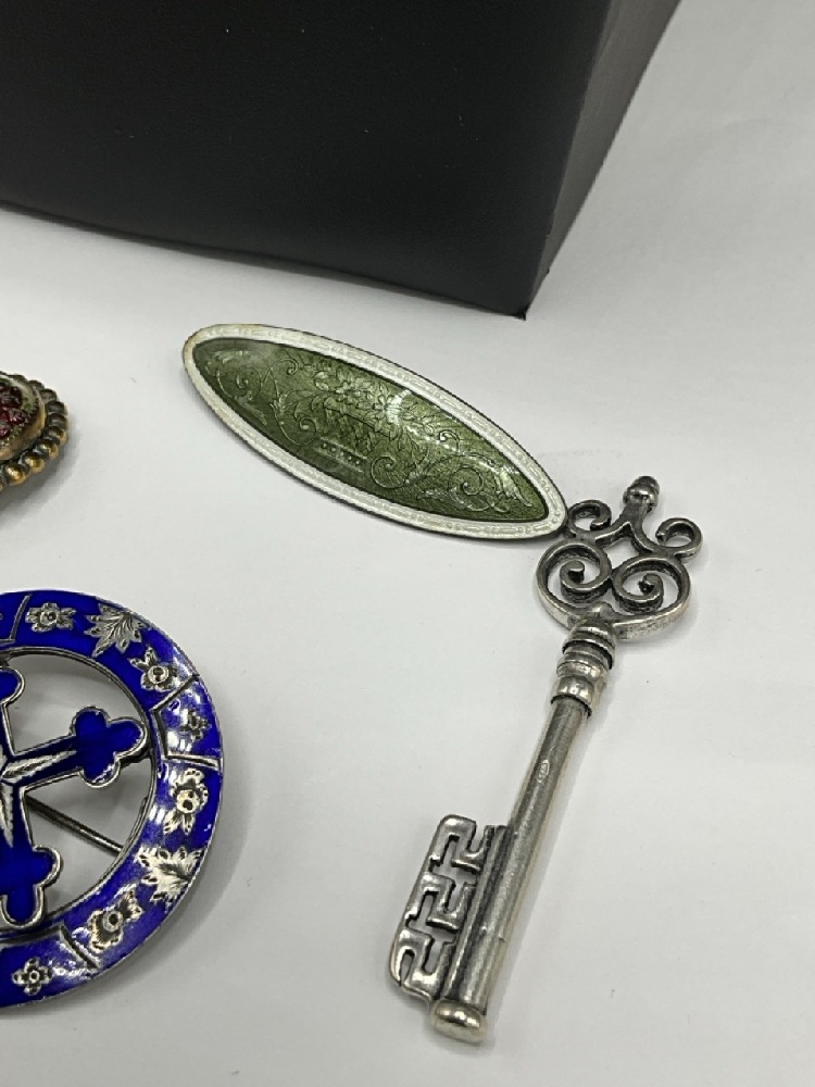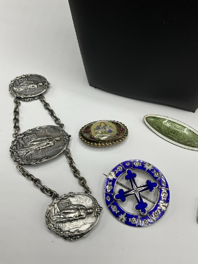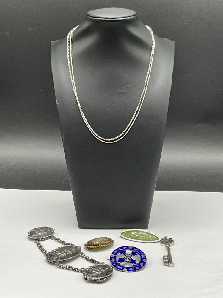 Compiled Vintage Sterling Silver and Silver Tone Jewelry. Necklaces, pins and clip. As seen in photograph preview.