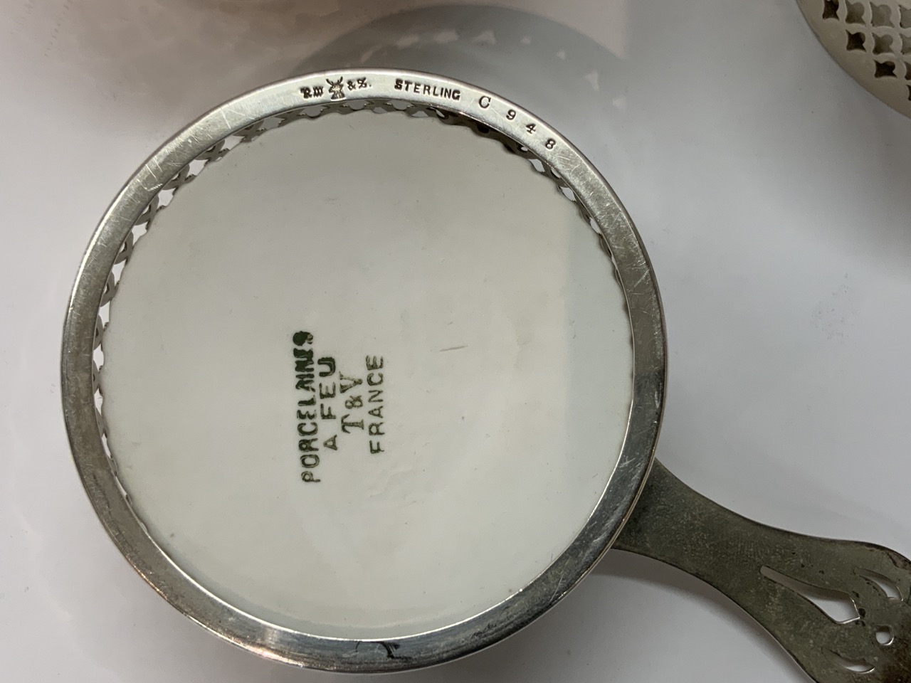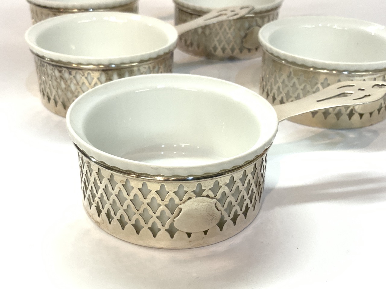 Sterling silver souffle cups with French porcelain inserts.