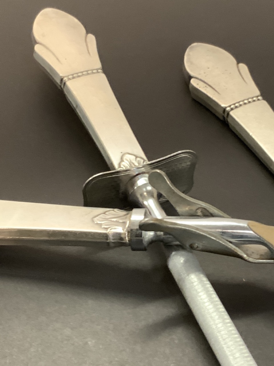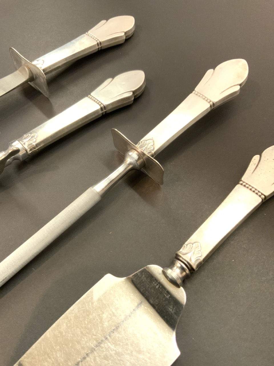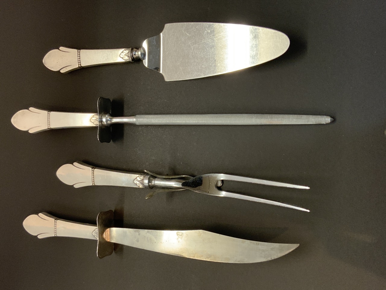 Sterling Silver Carving Set And Pie Server. Modern design handles. Marked sterling, stainless blades.
