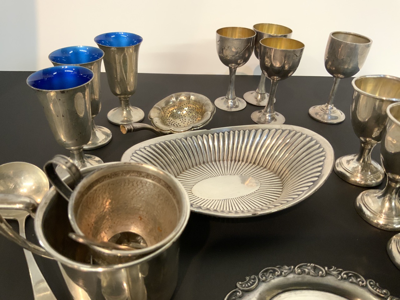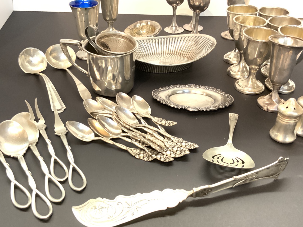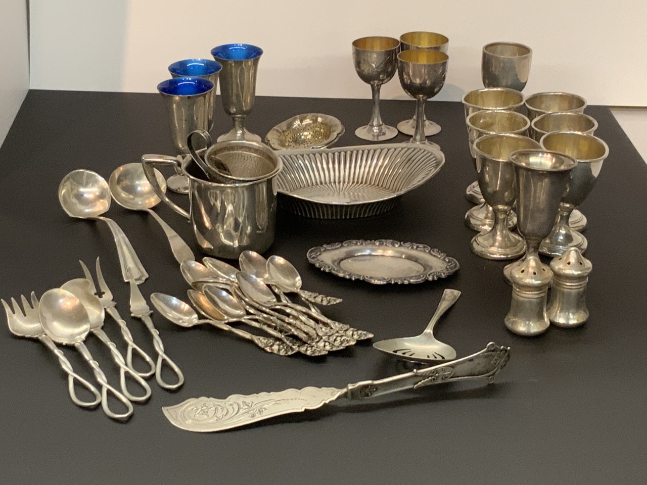 A compiled grouping of sterling silver table wares. Flatware, demitasse spoons, bowls, cordials etc.