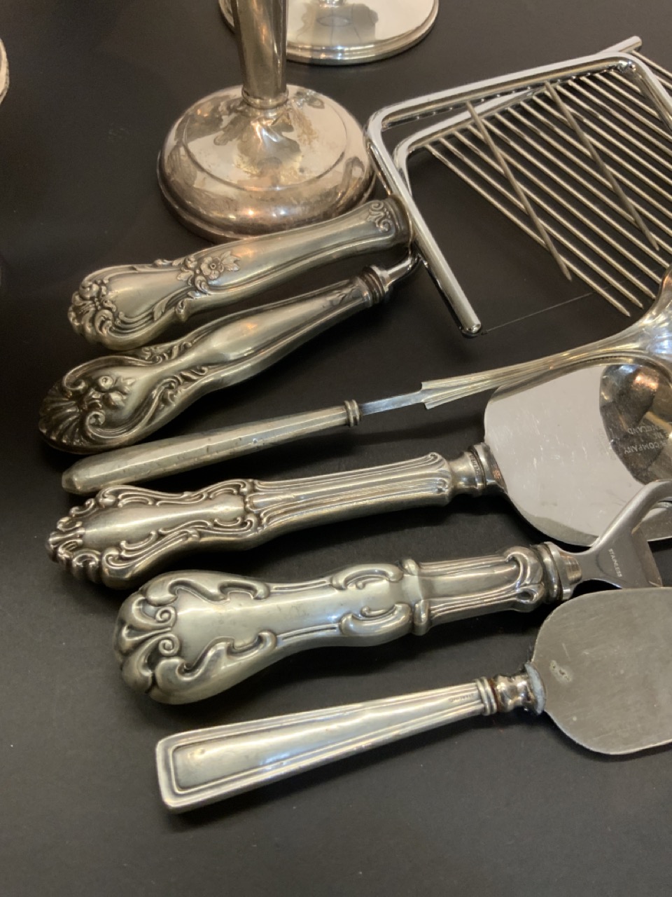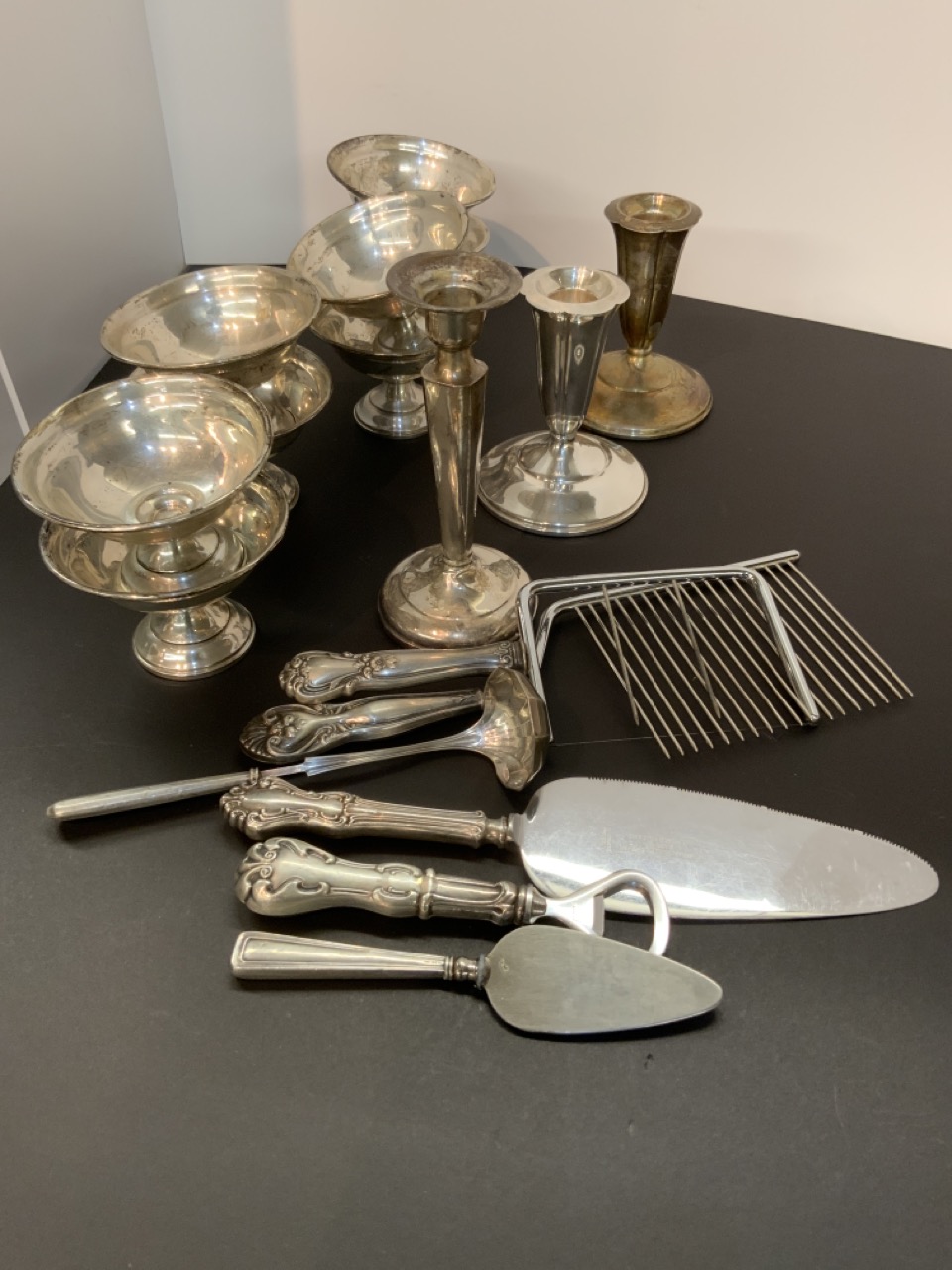 A compiled grouping of sterling silver table wares. All pieces are weighted.