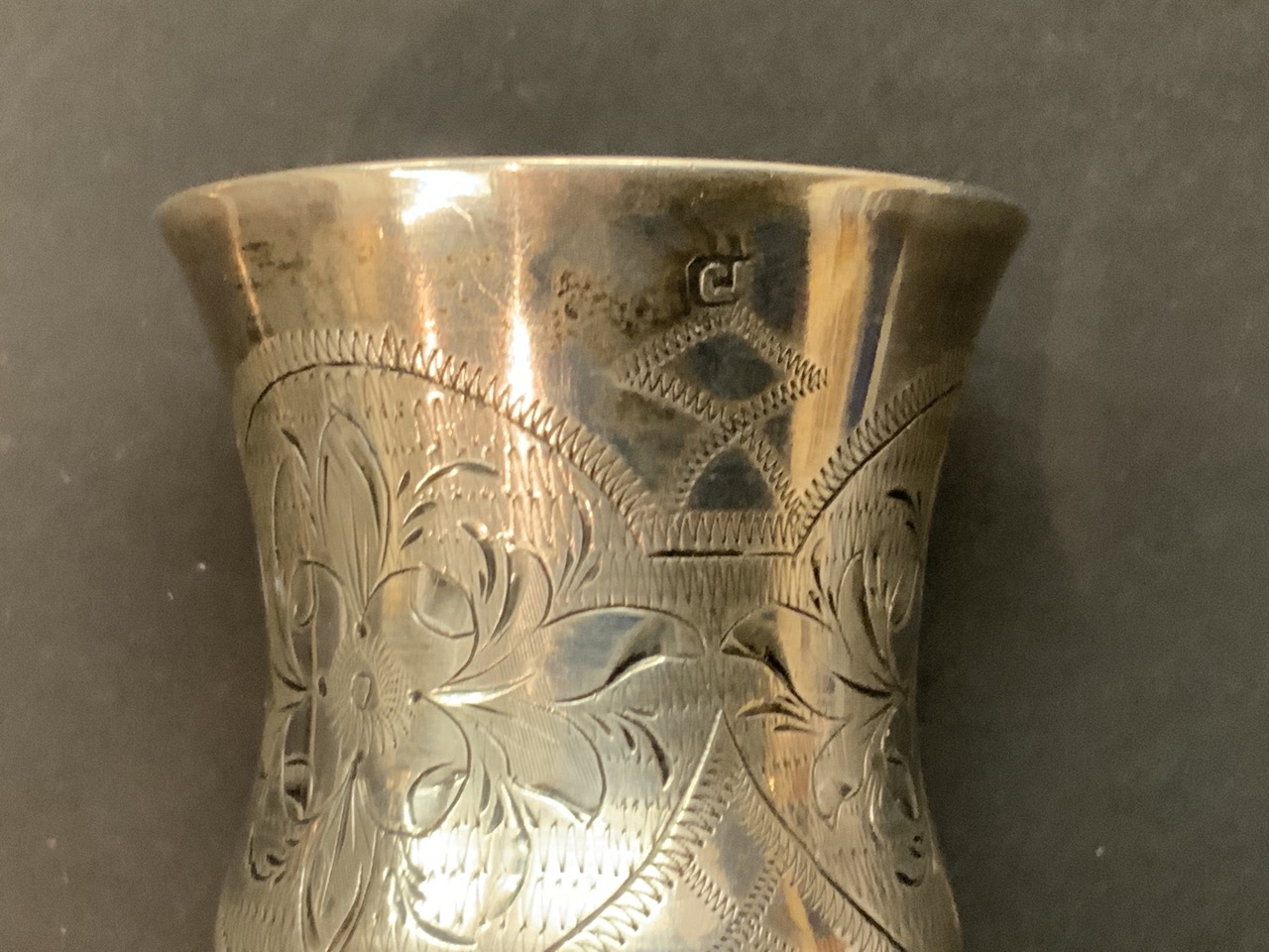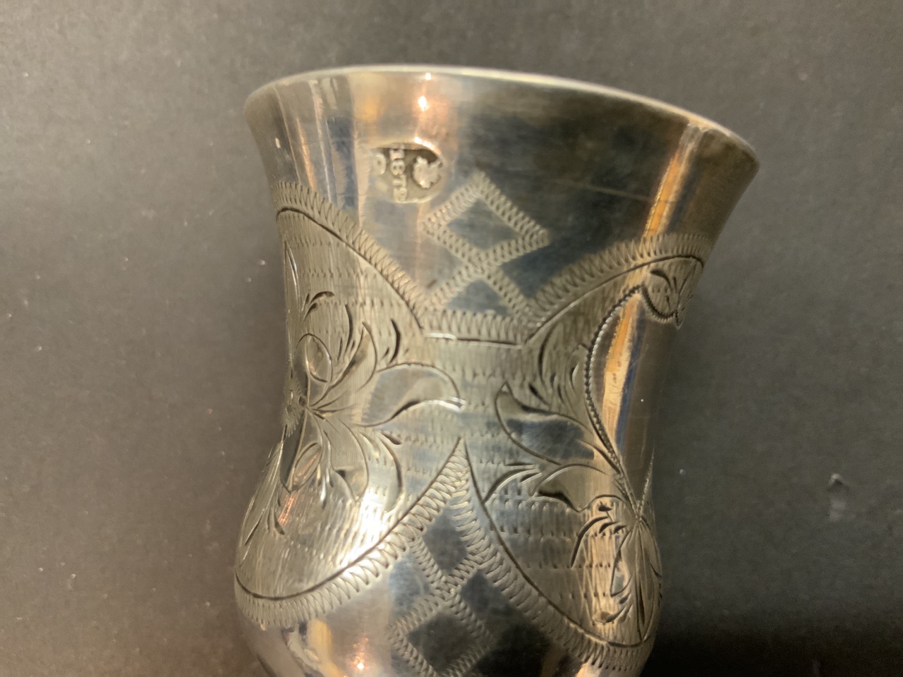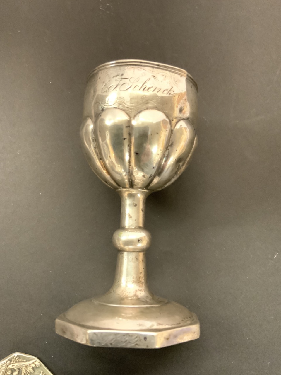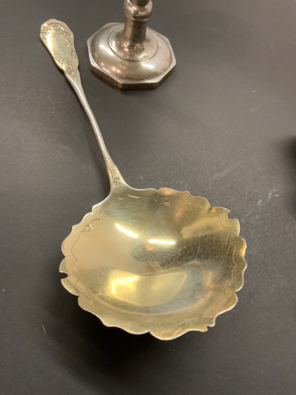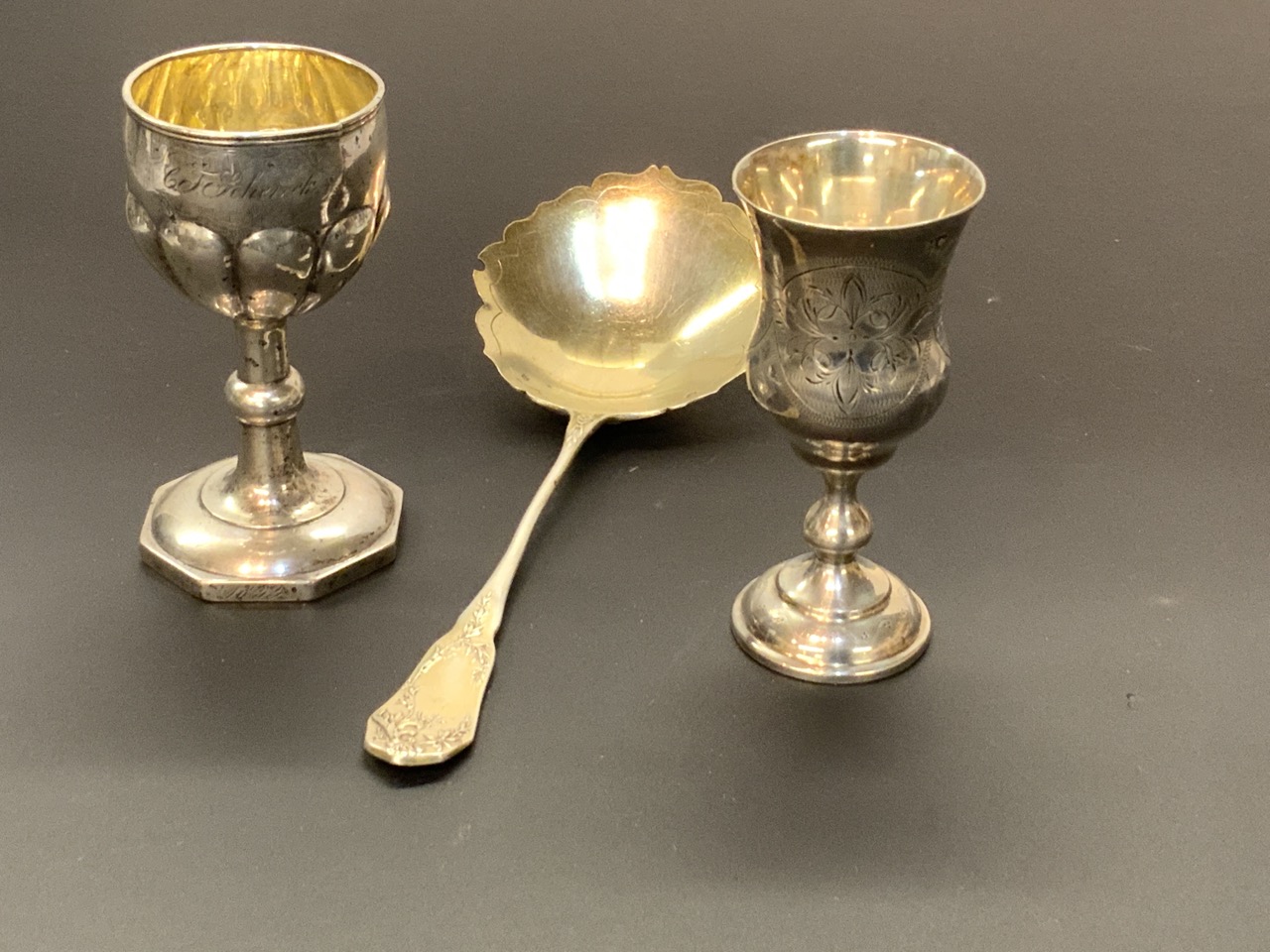 Three European silver groupings. A French gold wash serving spoon and two Judaica Kiddish cups, One Russian dated 1872.