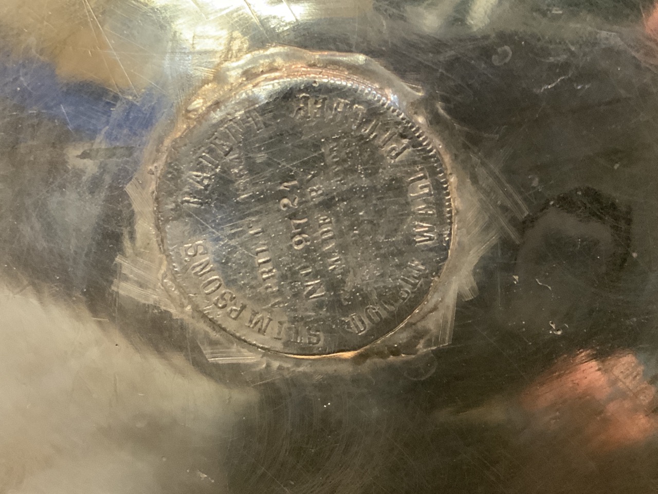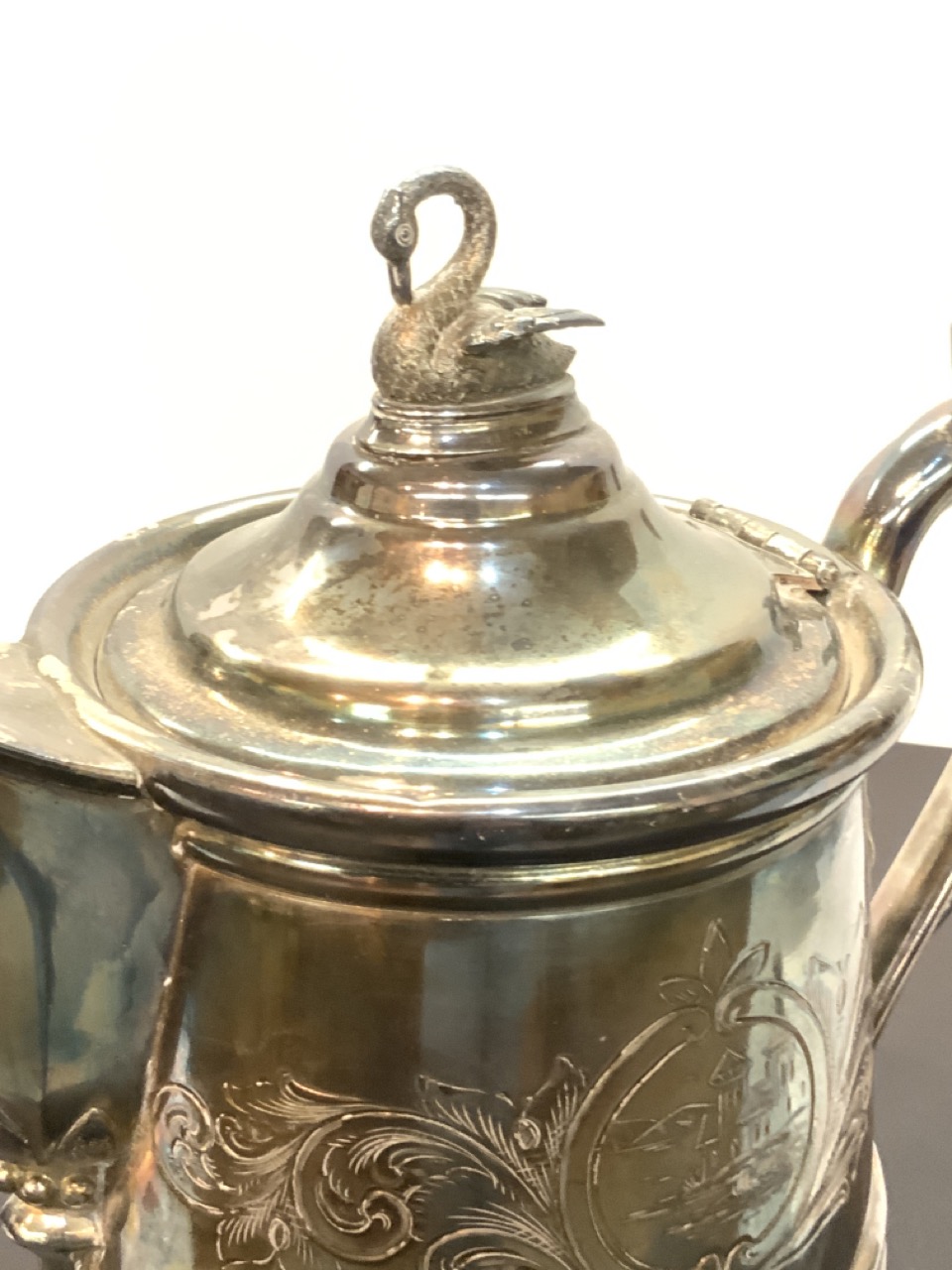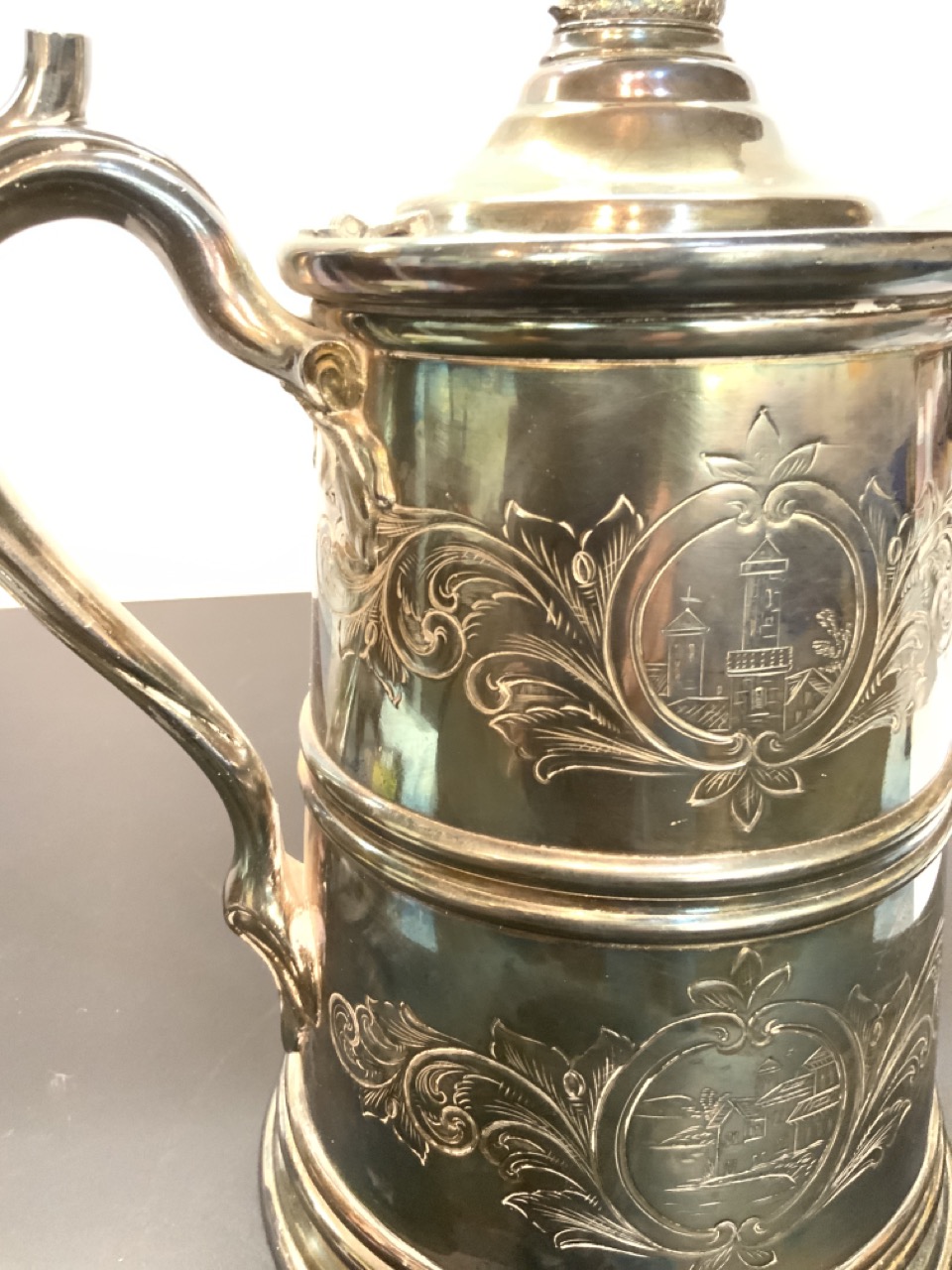 Victorian "Simpson's Patent" silver plated tankard with ornate etched design and swan finial top.