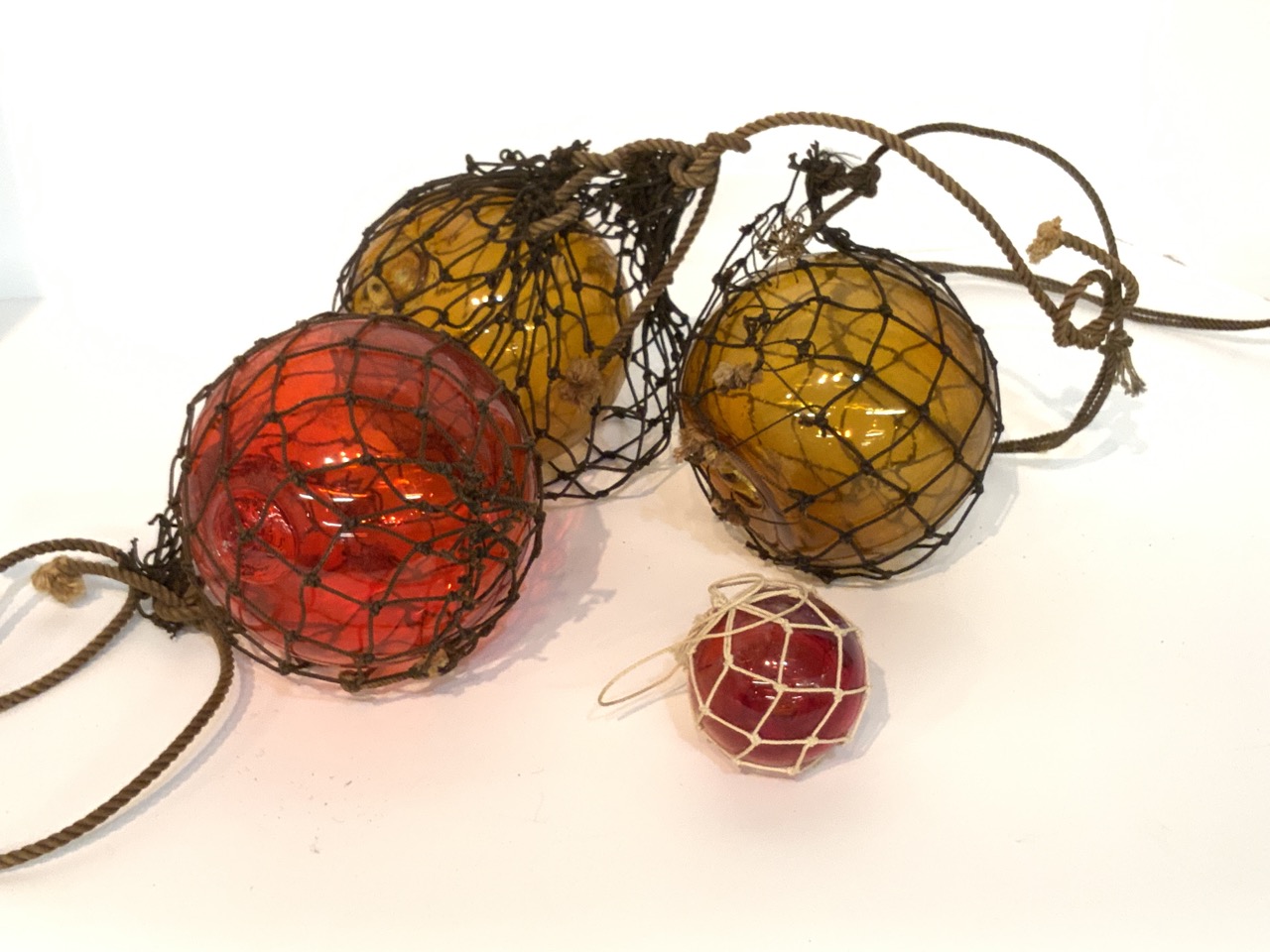 Three vintage 5" diameter nautical glass float balls and one 2 1/2".