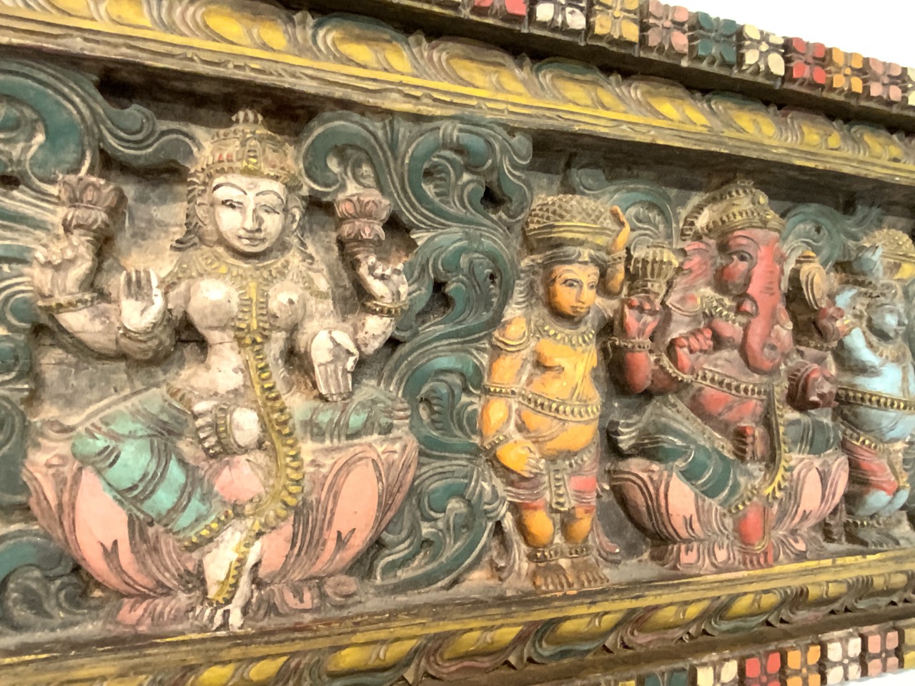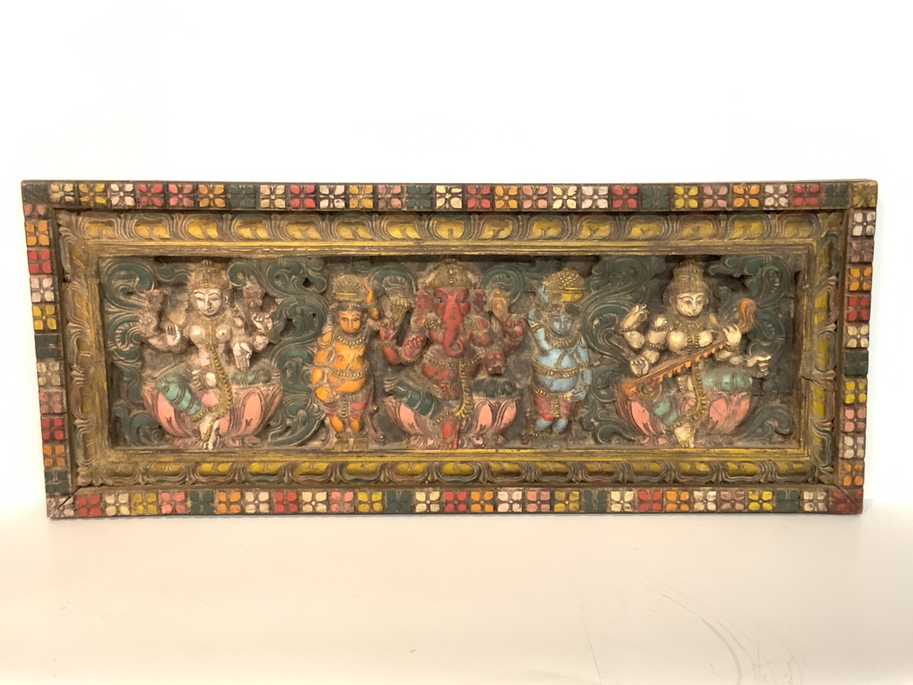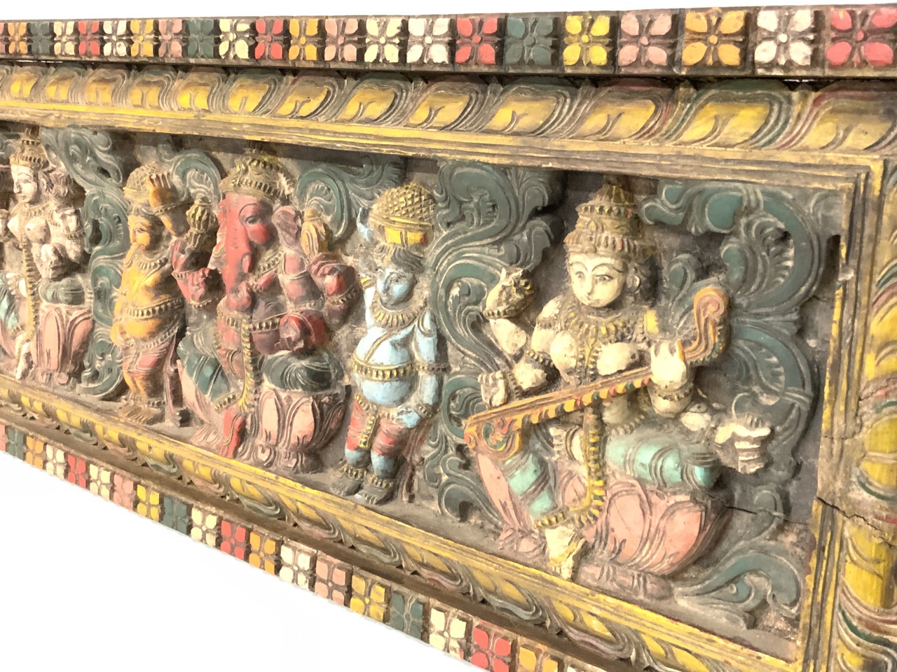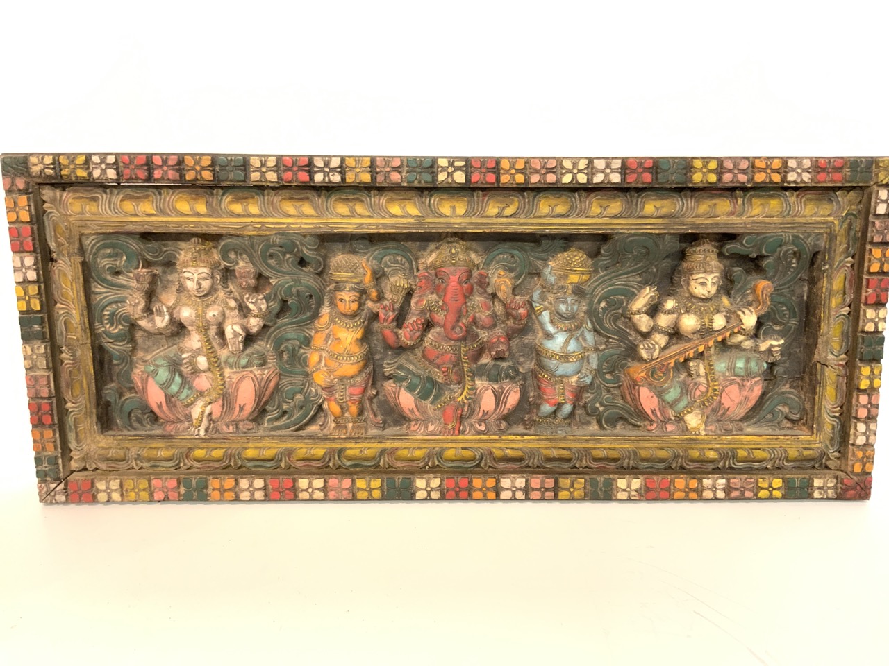 Indian Hindu hand carved polychrome painted panel wood panel with Hindu figures.