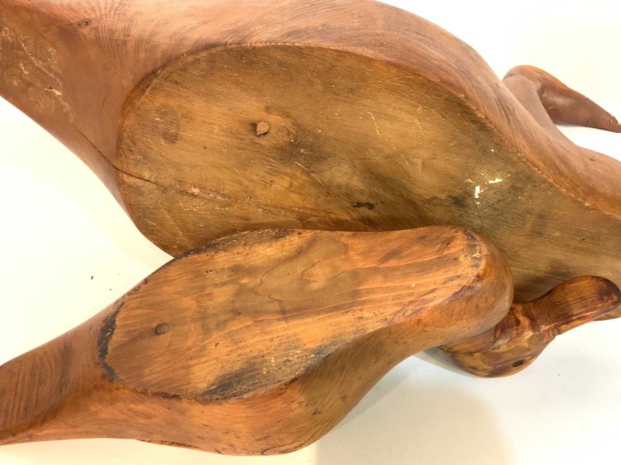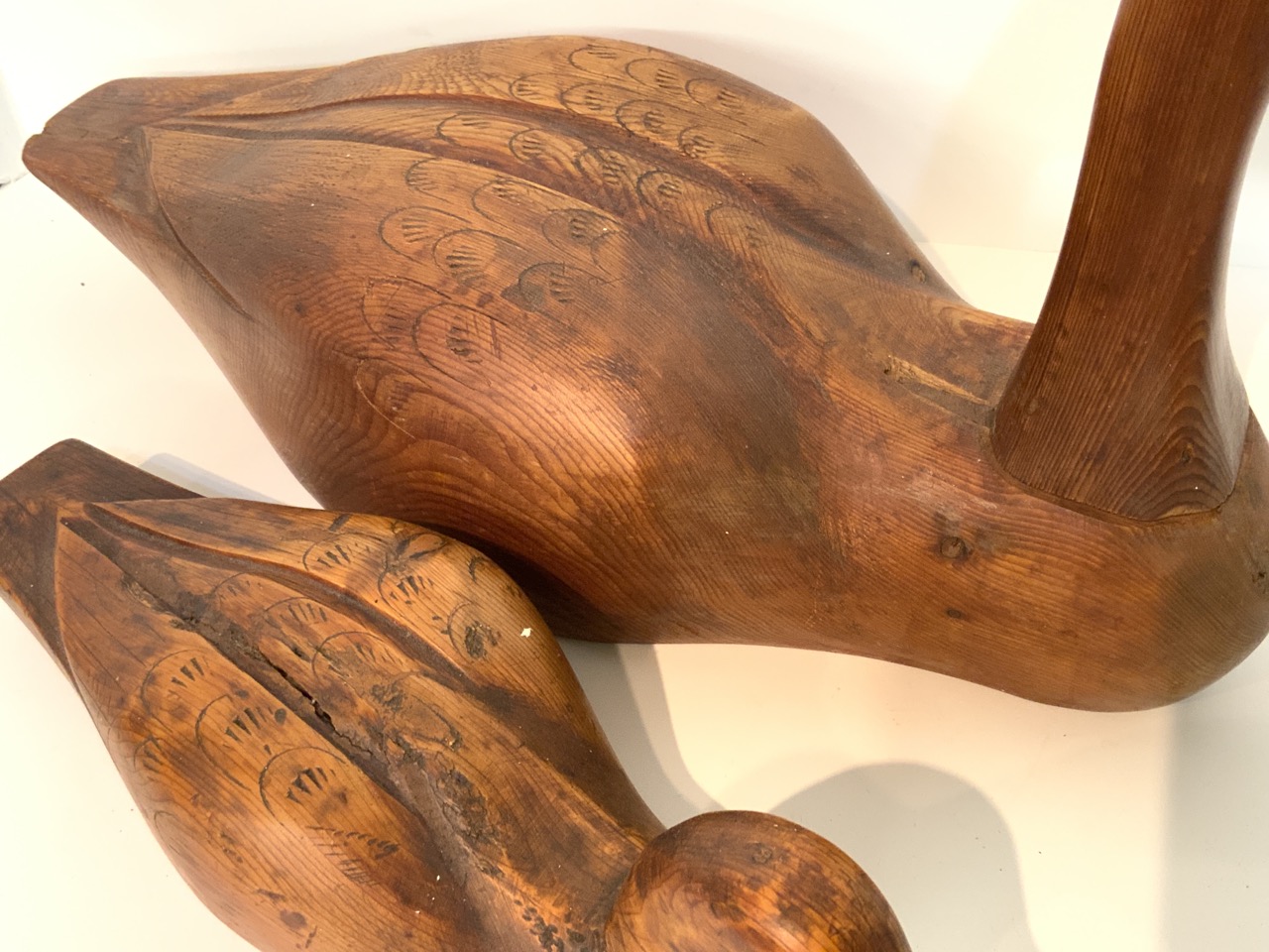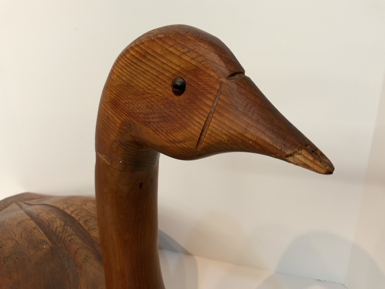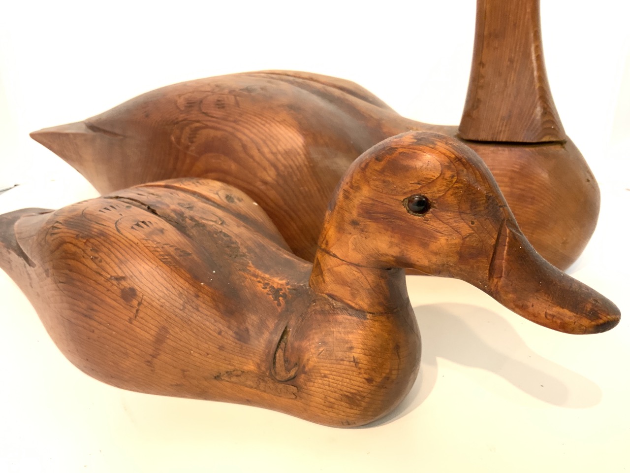 Two vintage bird decoys. Goose and Duck. Pine hardwood decorated.