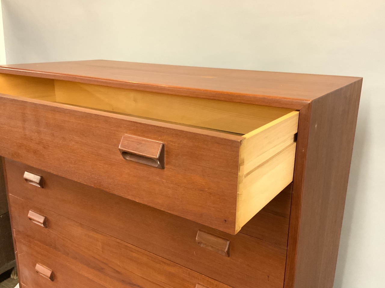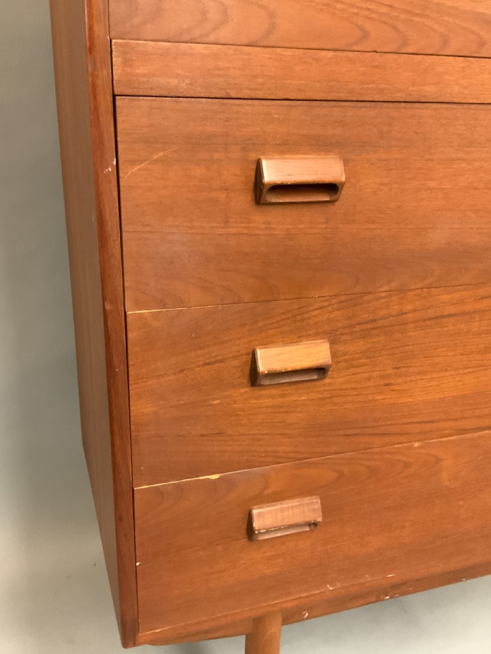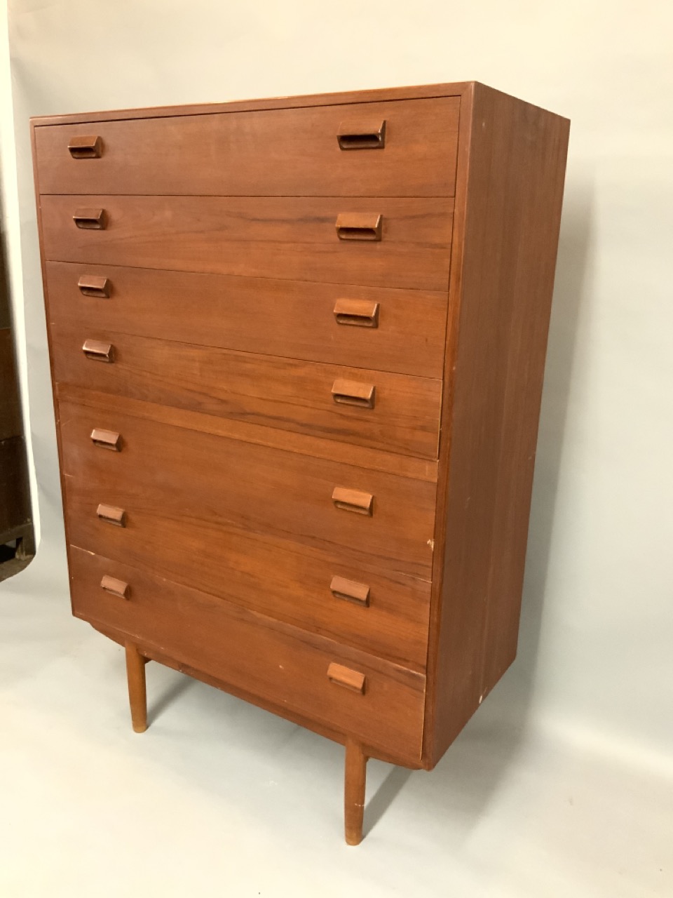 Danish Modern teakwood tall chest of drawers. Seven (7) drawers set on legs. Good condition.