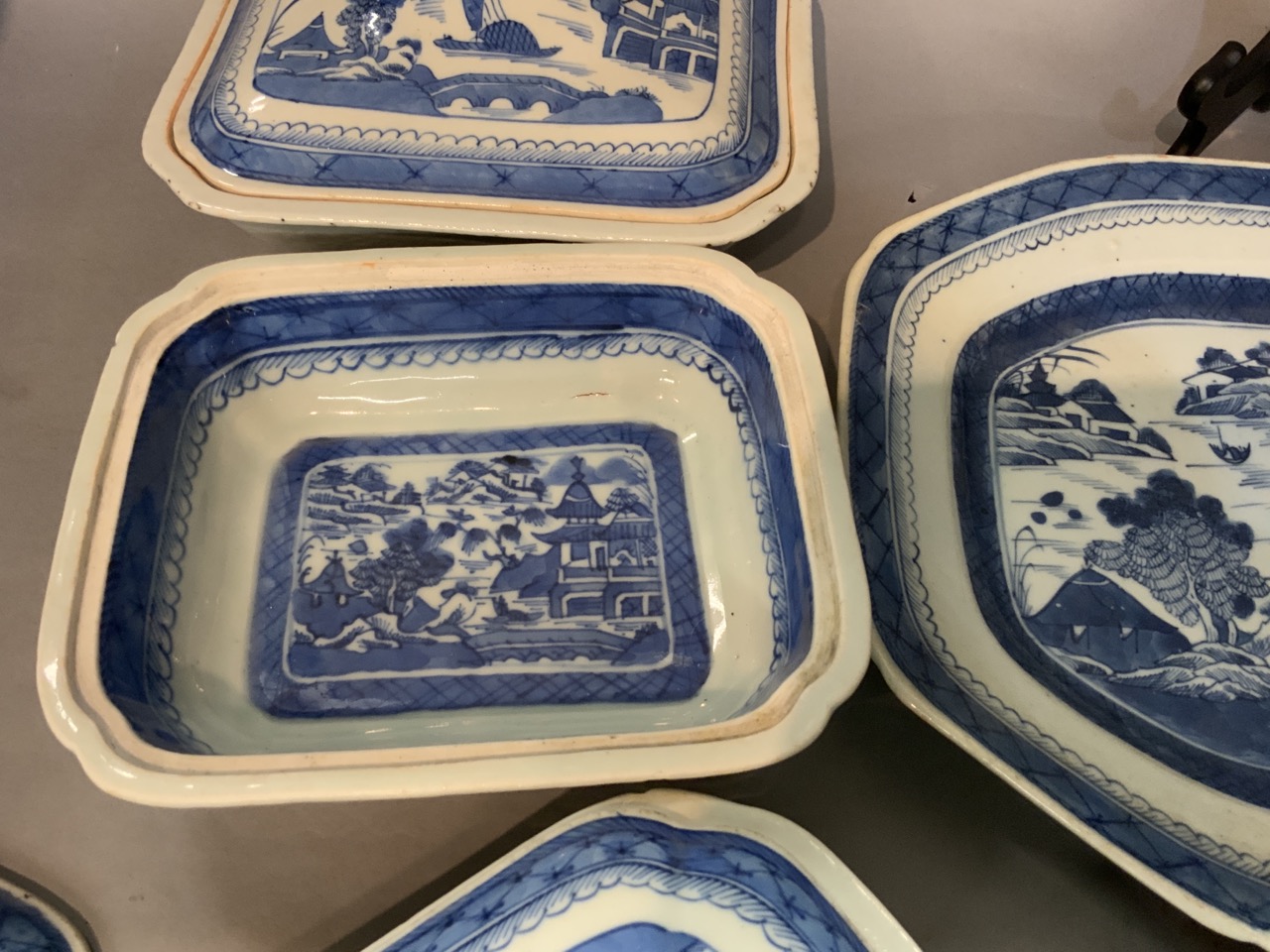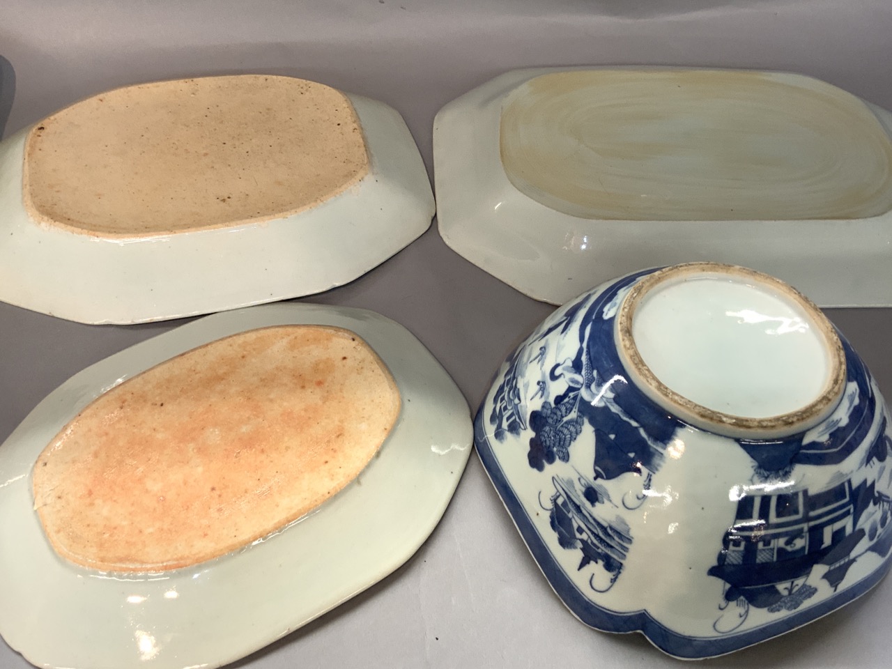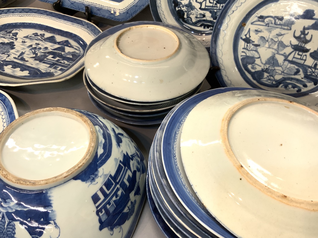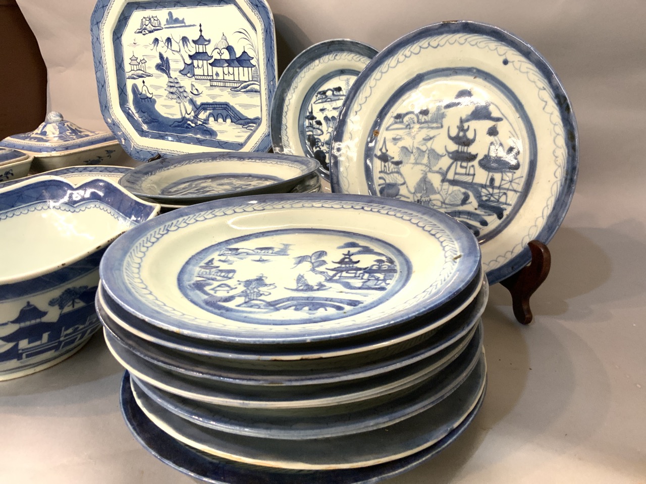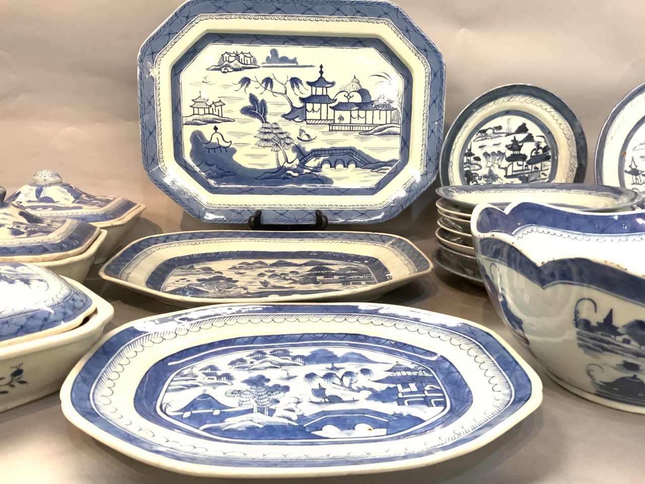 Collection of Chinese Canton porcelain platters, covered dishes and plates etc. Most in excellent condition. Any significant damaged pieces previously removed from lot.