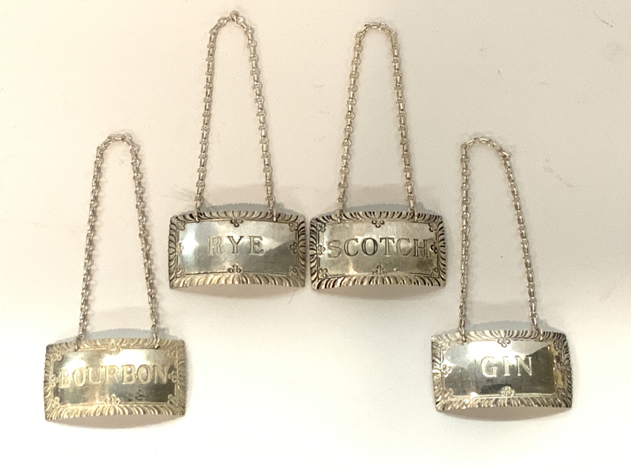 Four Sterling Silver Liquor Tags by Steiff for Williamsburg.