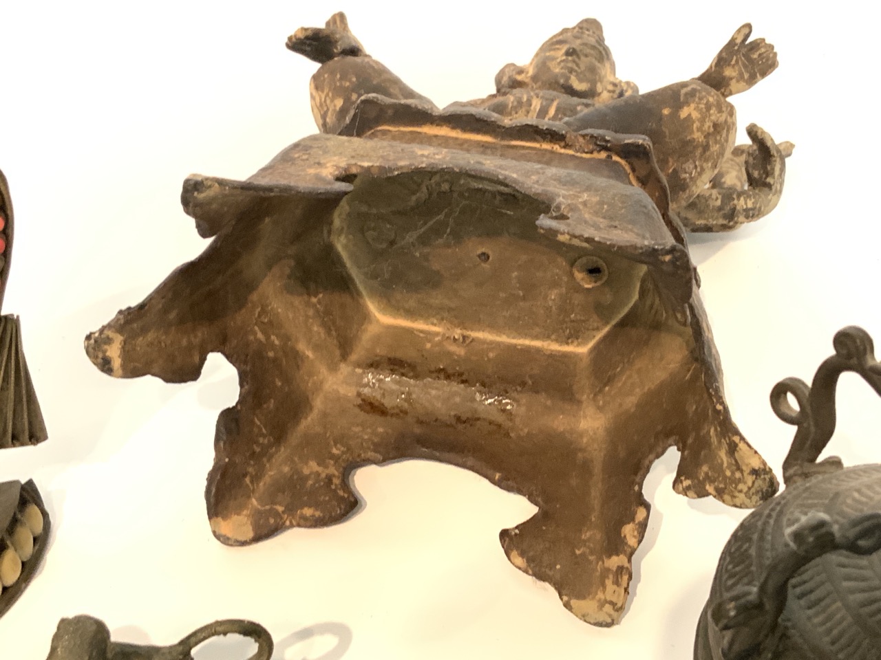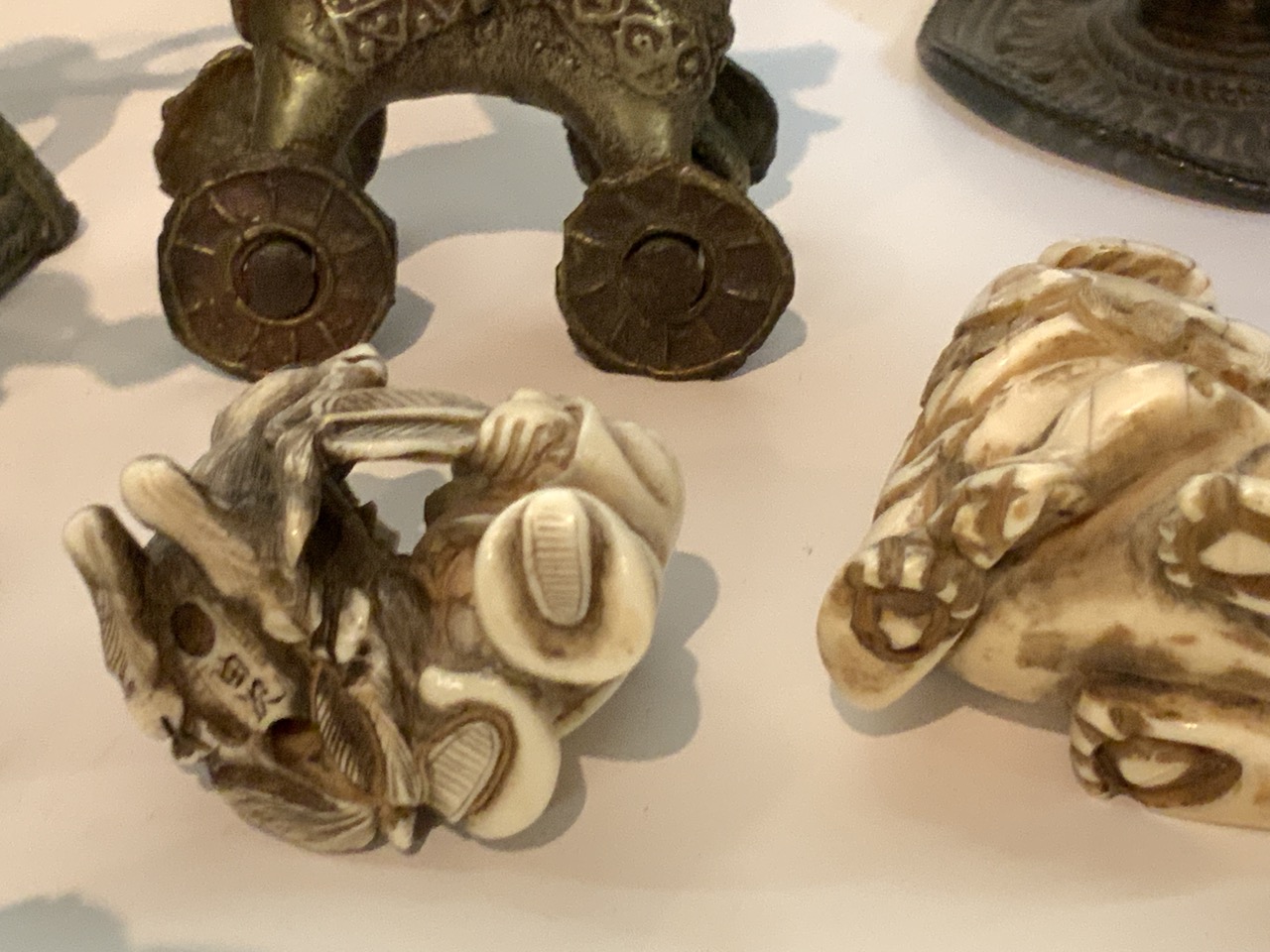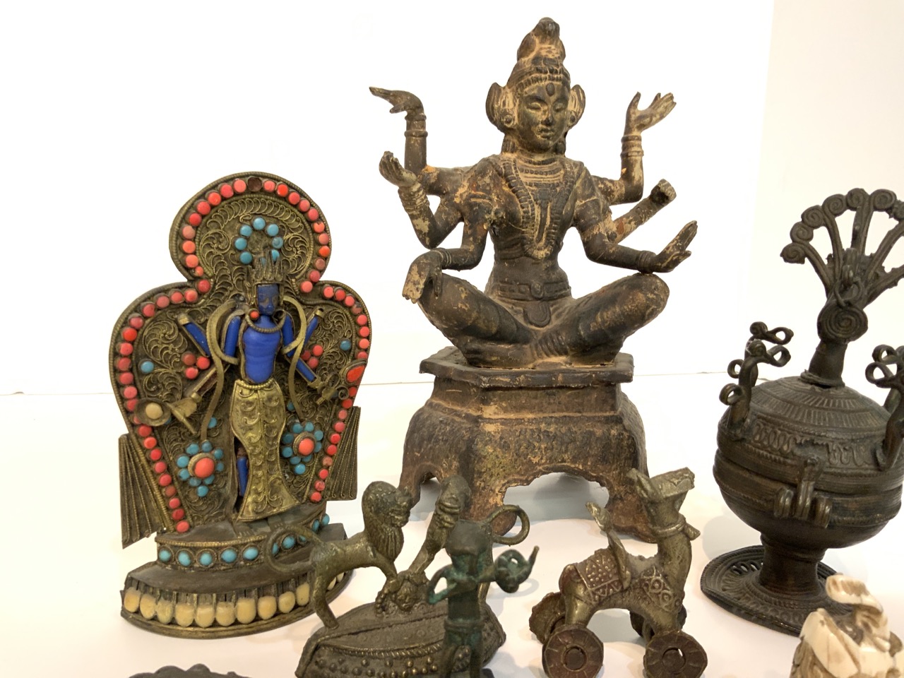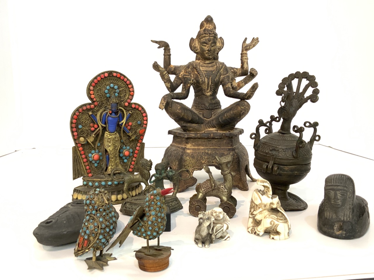 A compiled grouping of estate curio objects mostly related to Hindu.