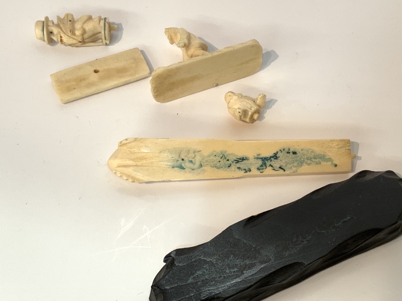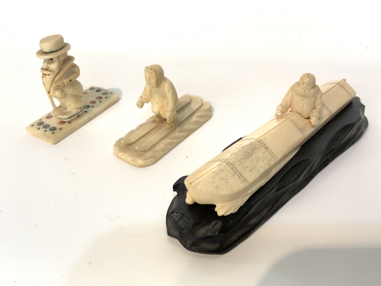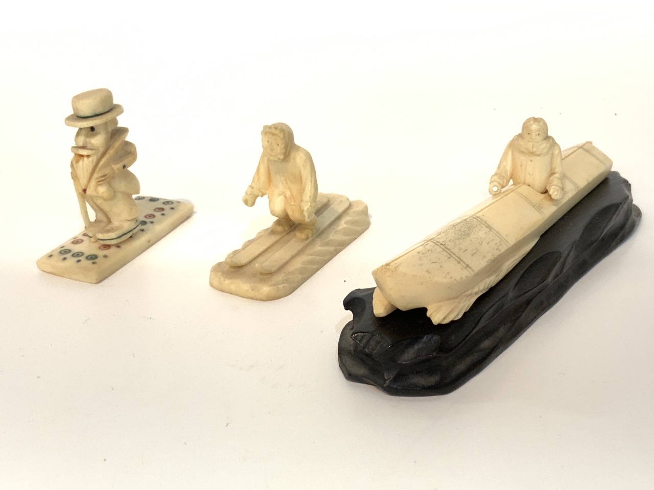 Three whale bone Inuit style carvings. One with Alaskan Eskimo on skis 2" X 2 1/2" , Japanese fisherman 1" X 5 1/2" and carved man (unknown maker).