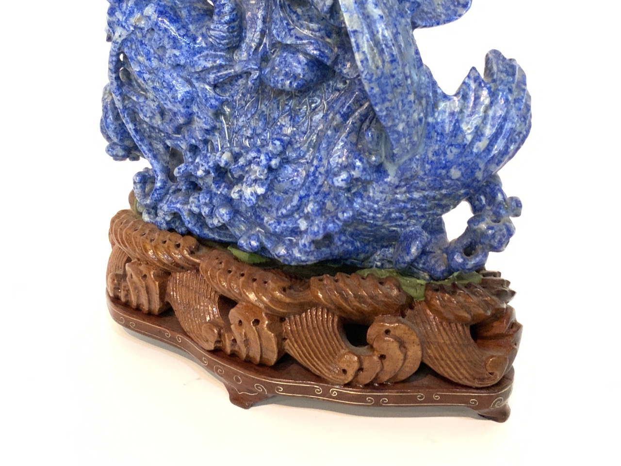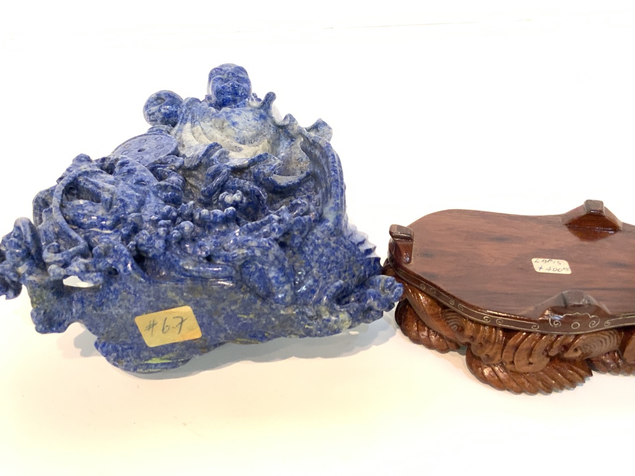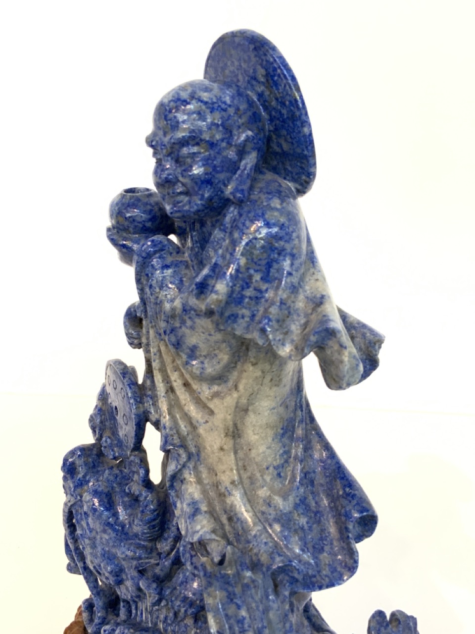 A fine carved piece of lapis stone statue in form of Buddha with carved exotic wood base.