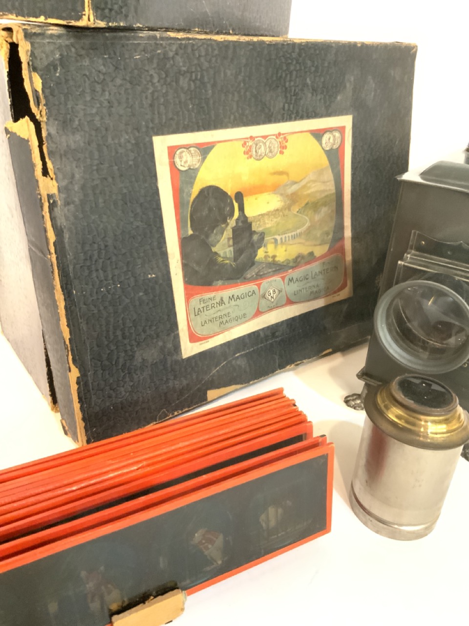 Victorian Magic Lantern with slides. Original box. Near mint condition. Missing lamp.