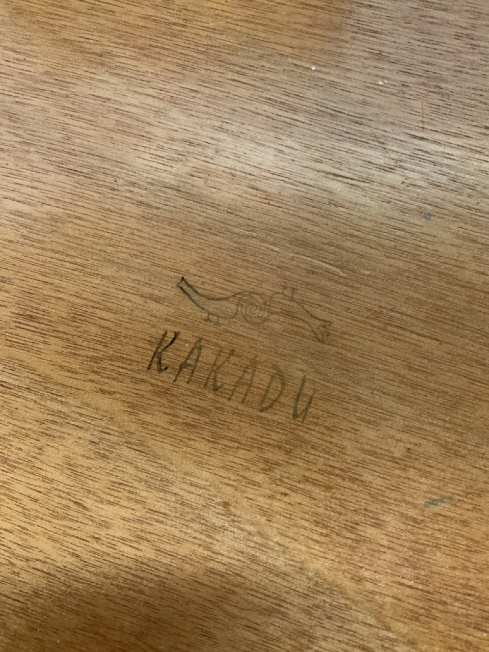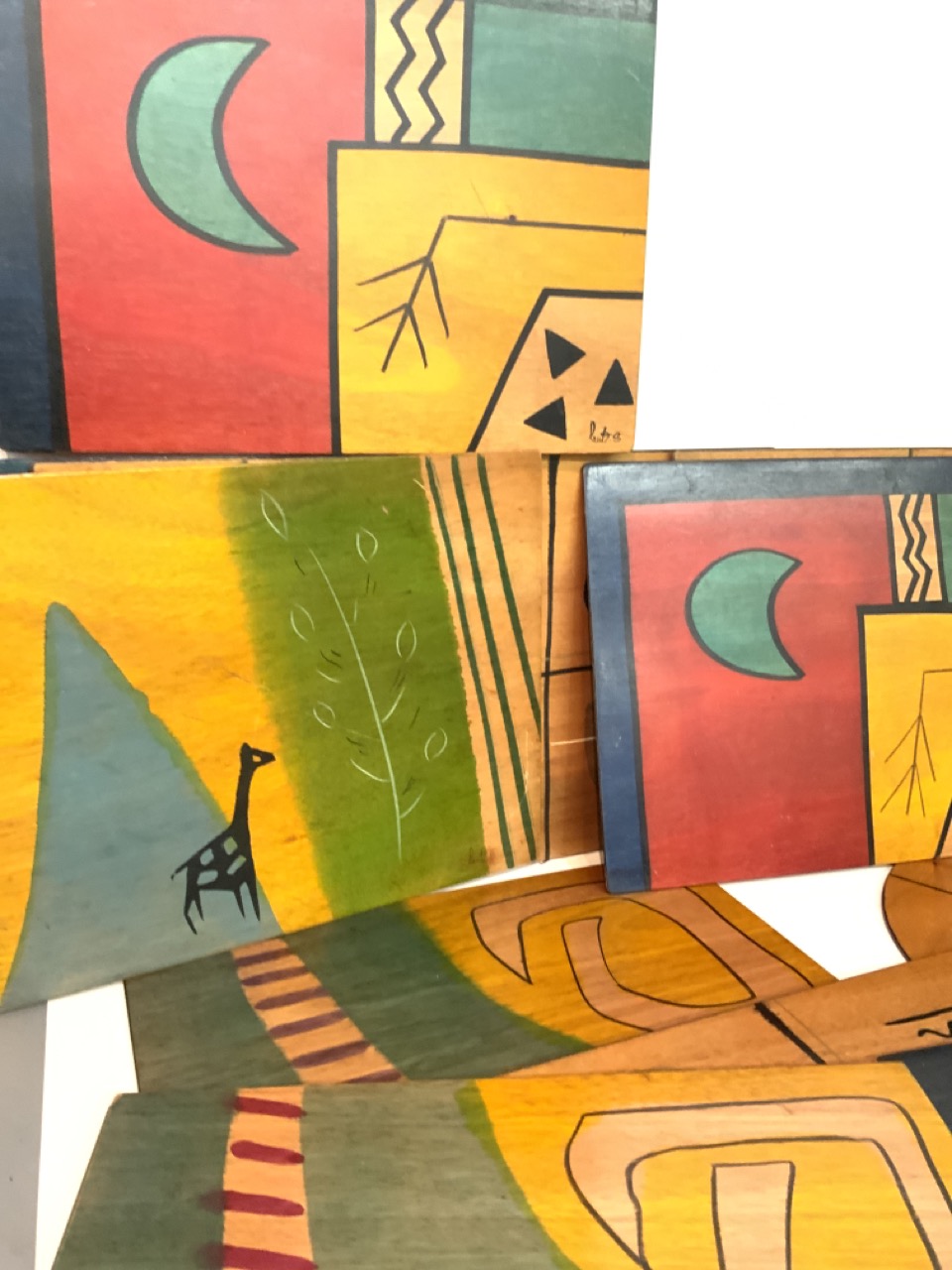 Twelve Kakadu wooden place mats. Eleven rectangular 12" X 16" and one round 14 1/2"d. Coloful hand painted Mid Century kitchen decor.