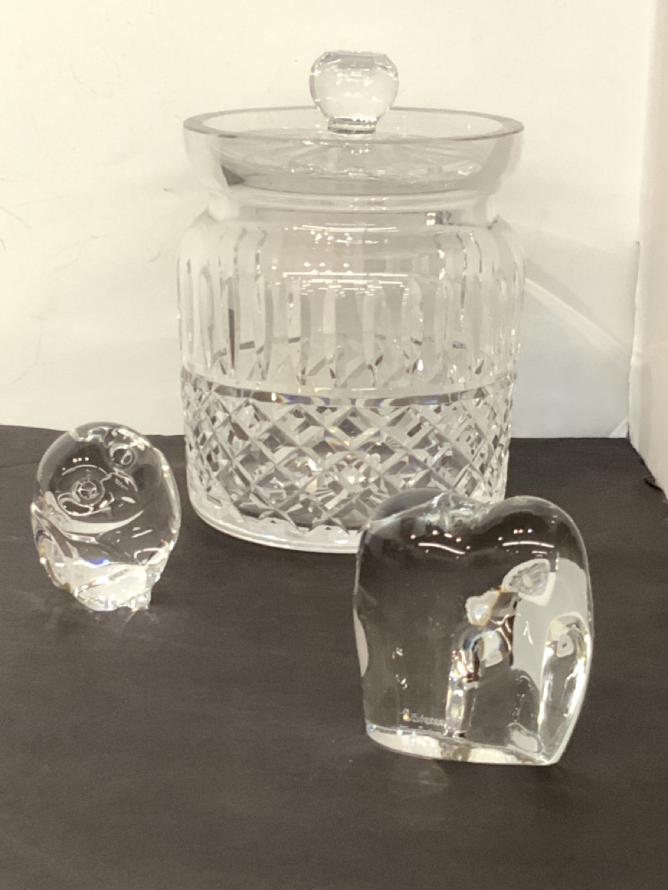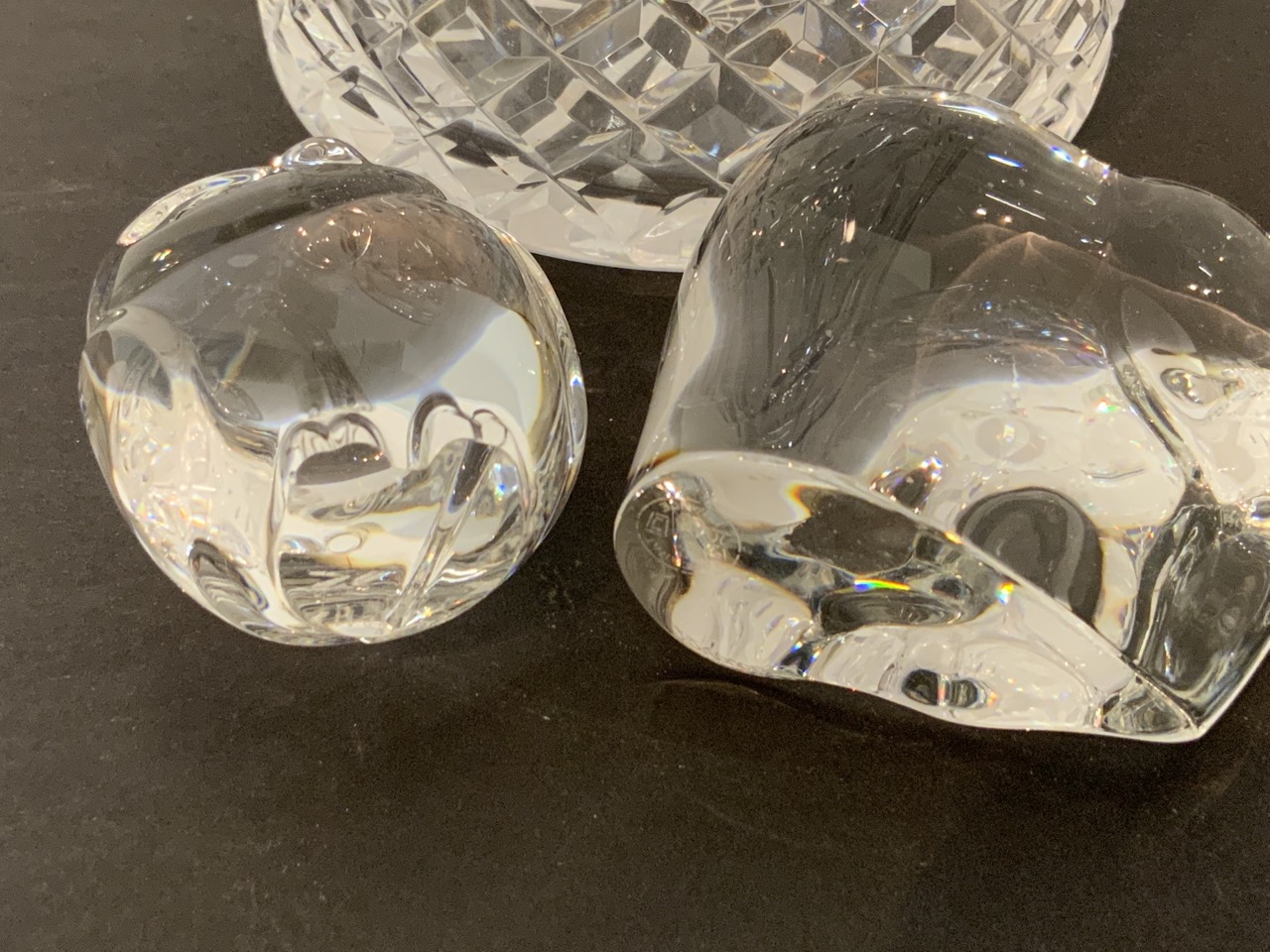 Wateford humidor, Baccarat elephant and Steuben crystal owl.