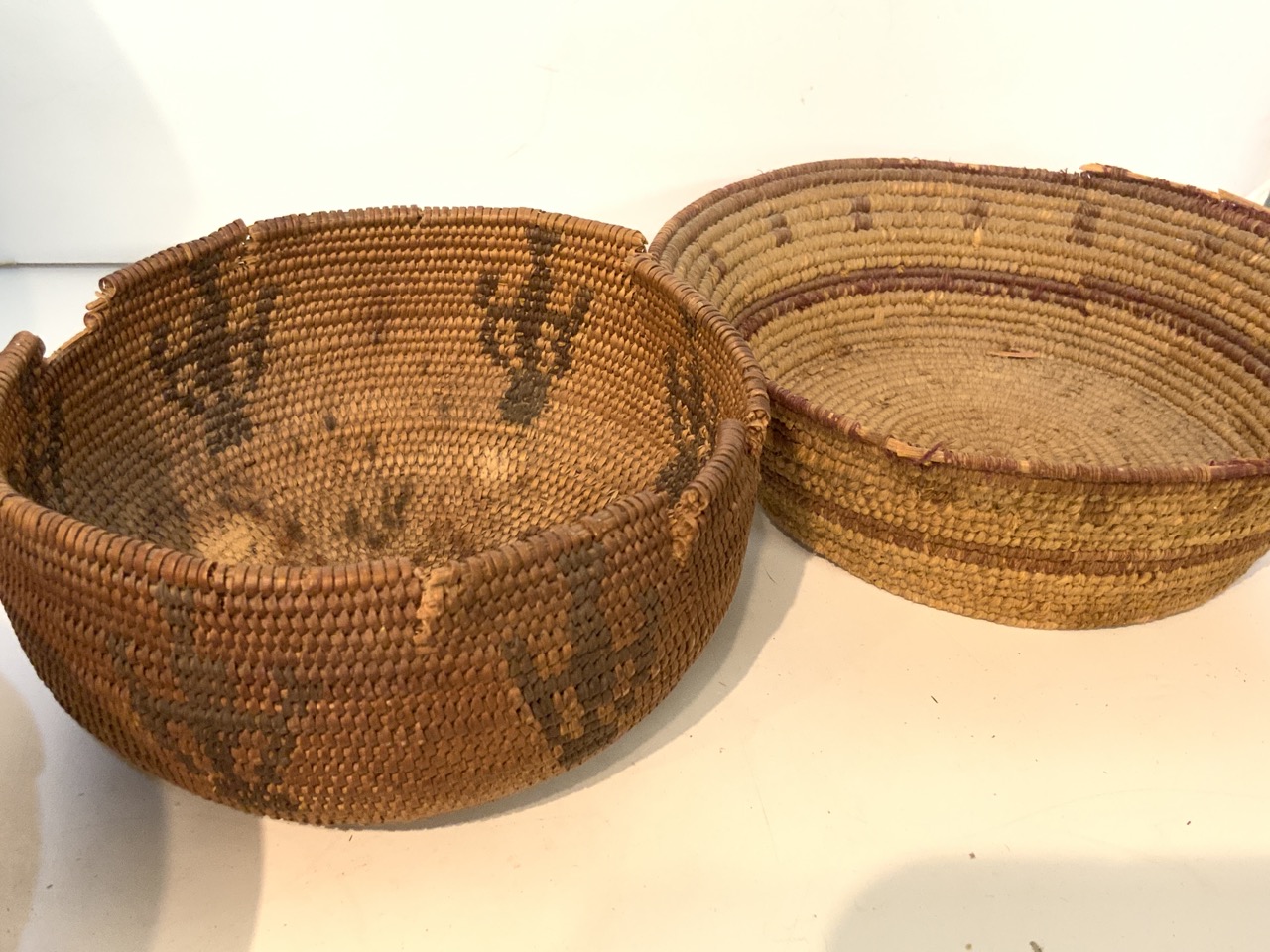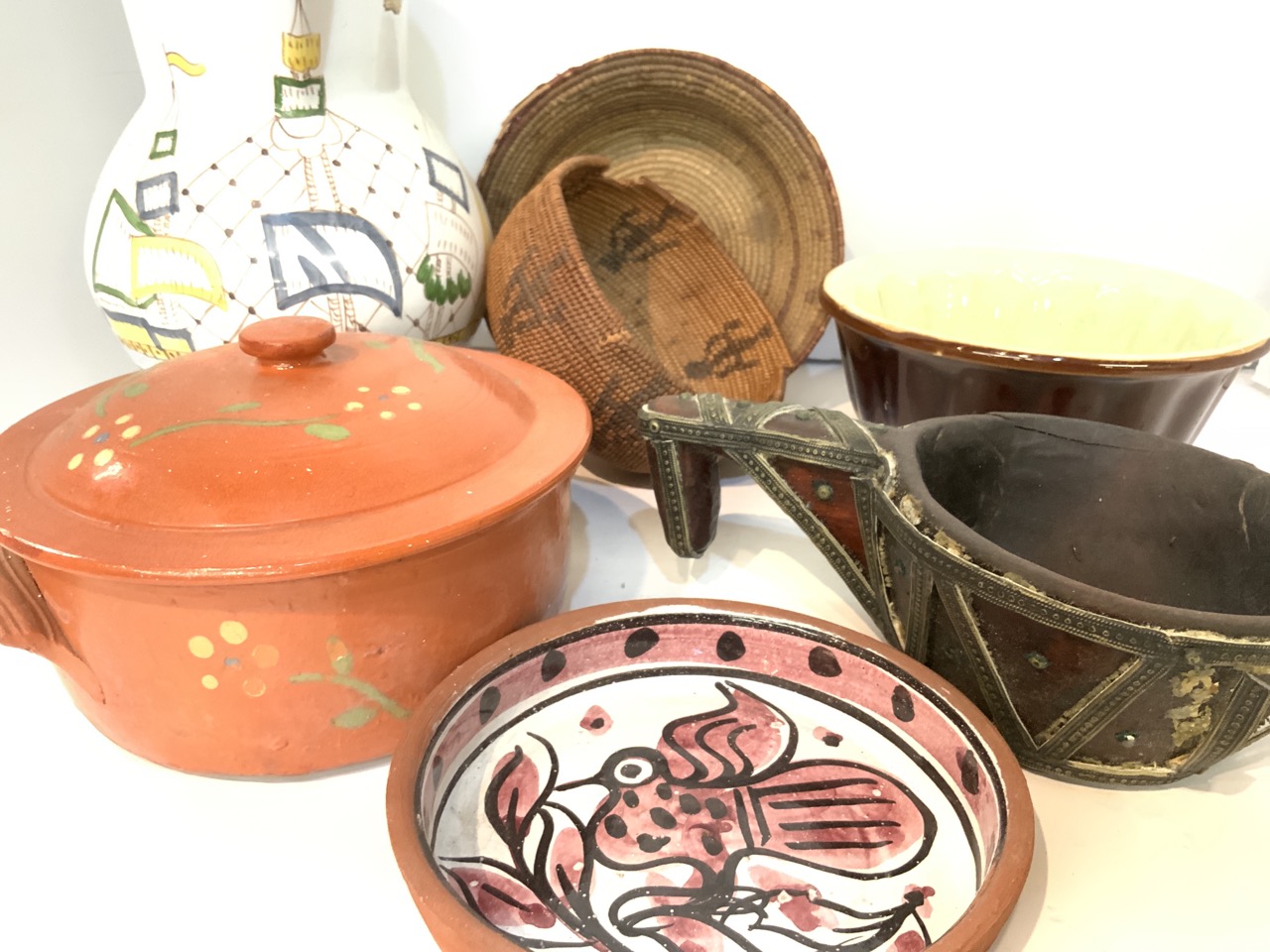 A compiled grouping of decorative wares. Alyarve terra-cotta dish, molds, Mexican pot, two native baskets, Portugese pitcher etc.