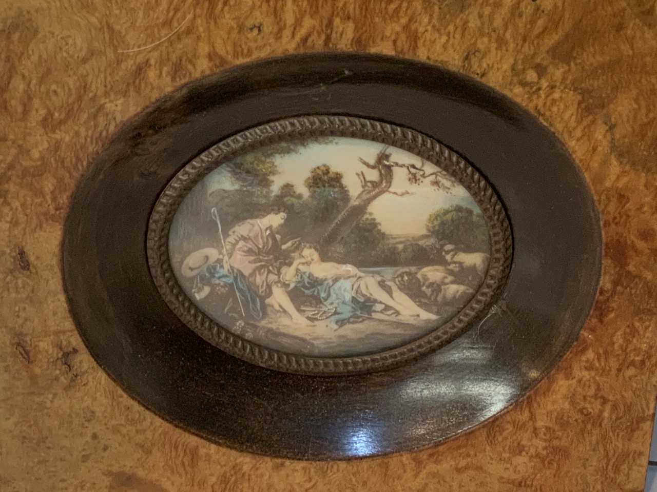 with no visible signature and in burl wood frame