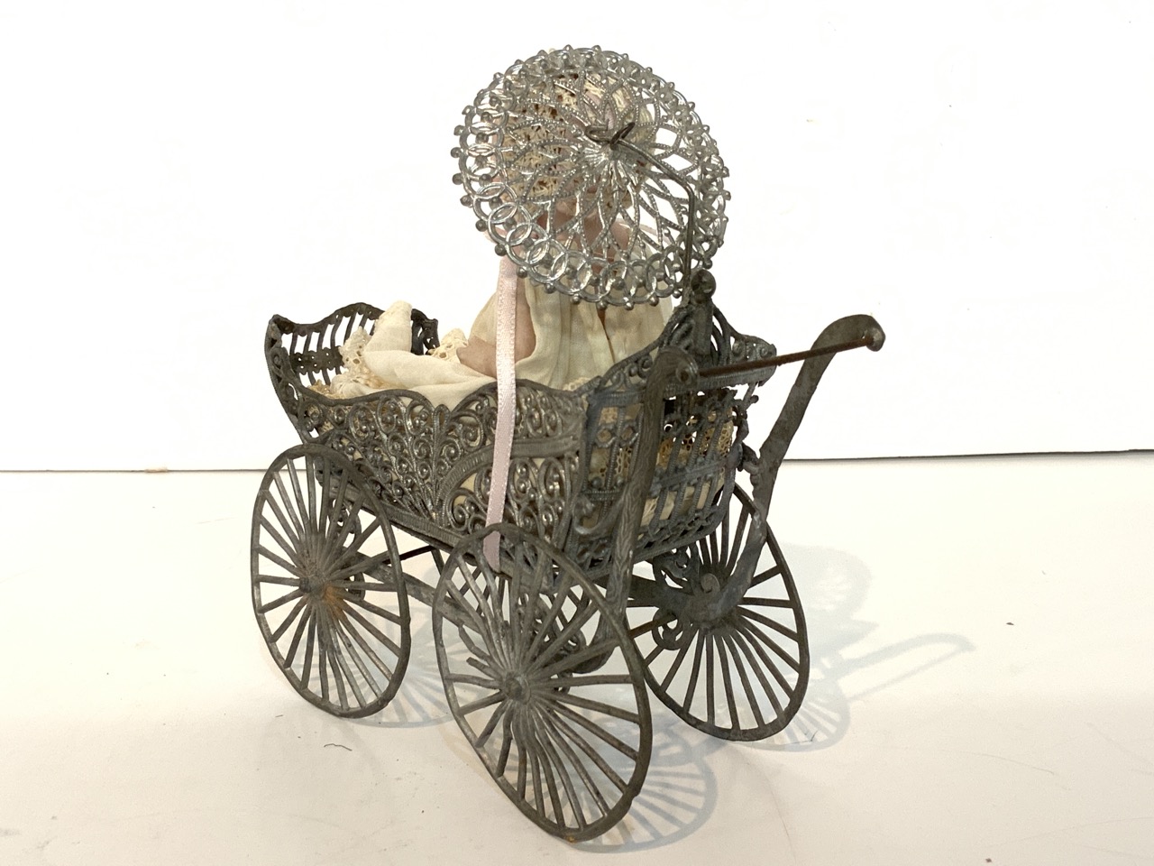 An early 20th century white metal doll carriage with Bye Lo style German bisque doll 4"L.