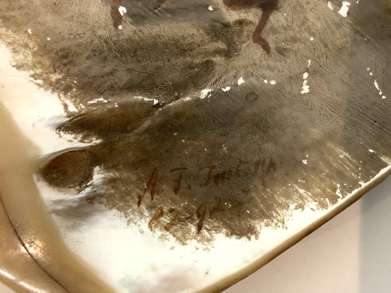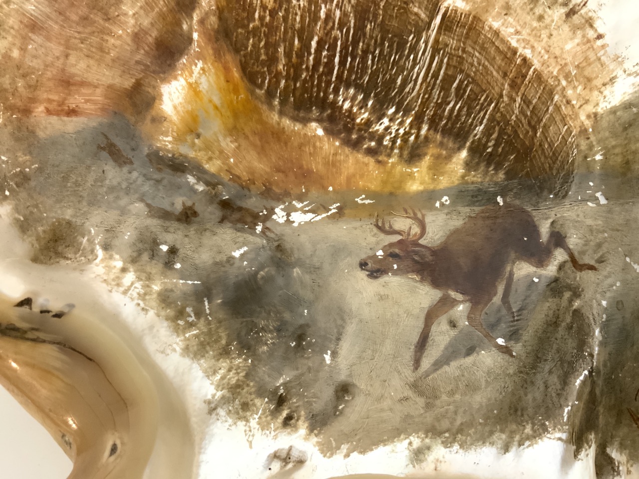 19th Century Mother Of Pearl shell with painted deer in landscape.