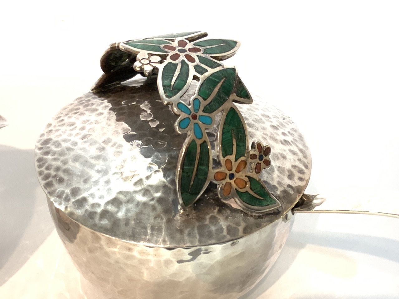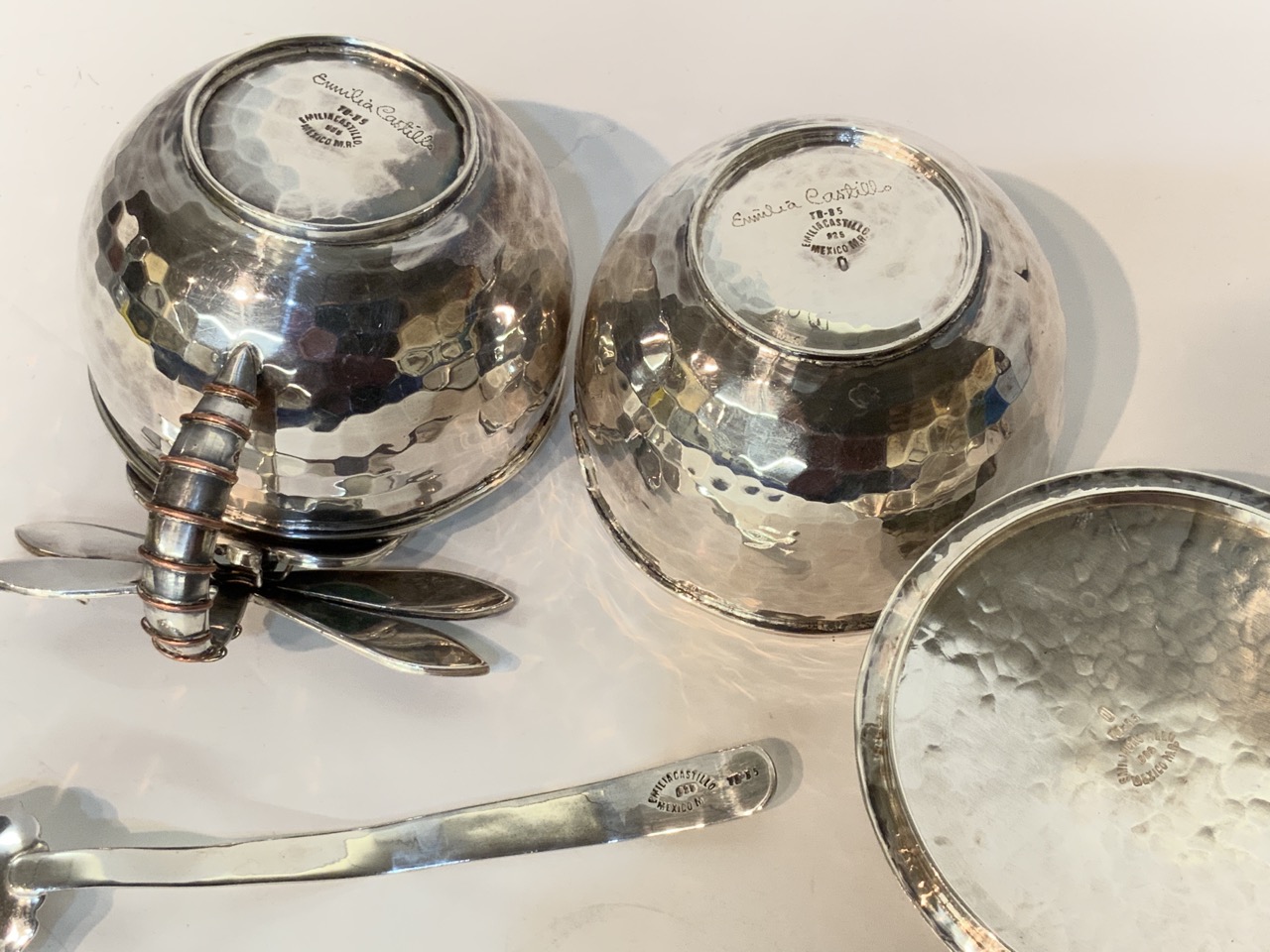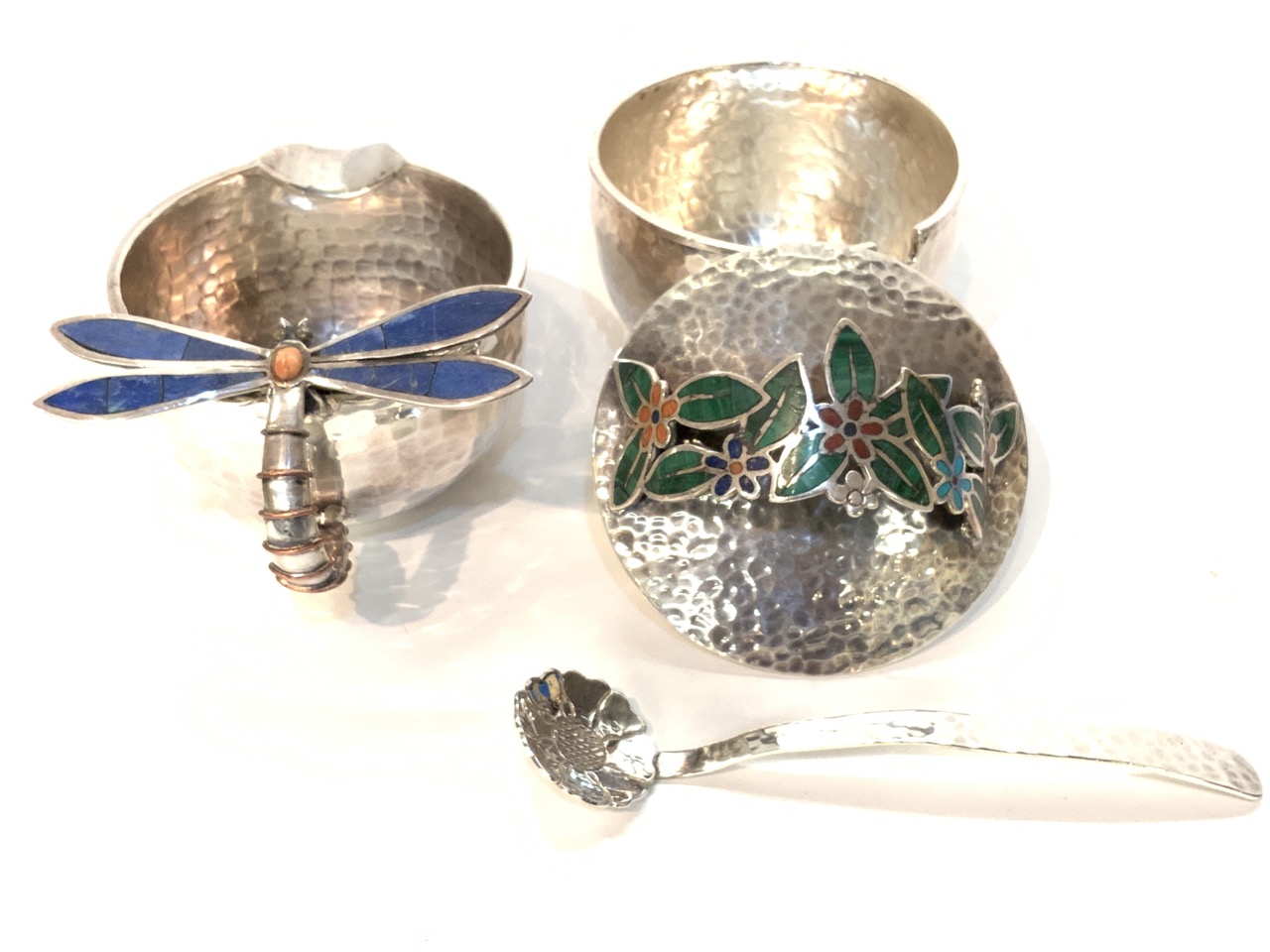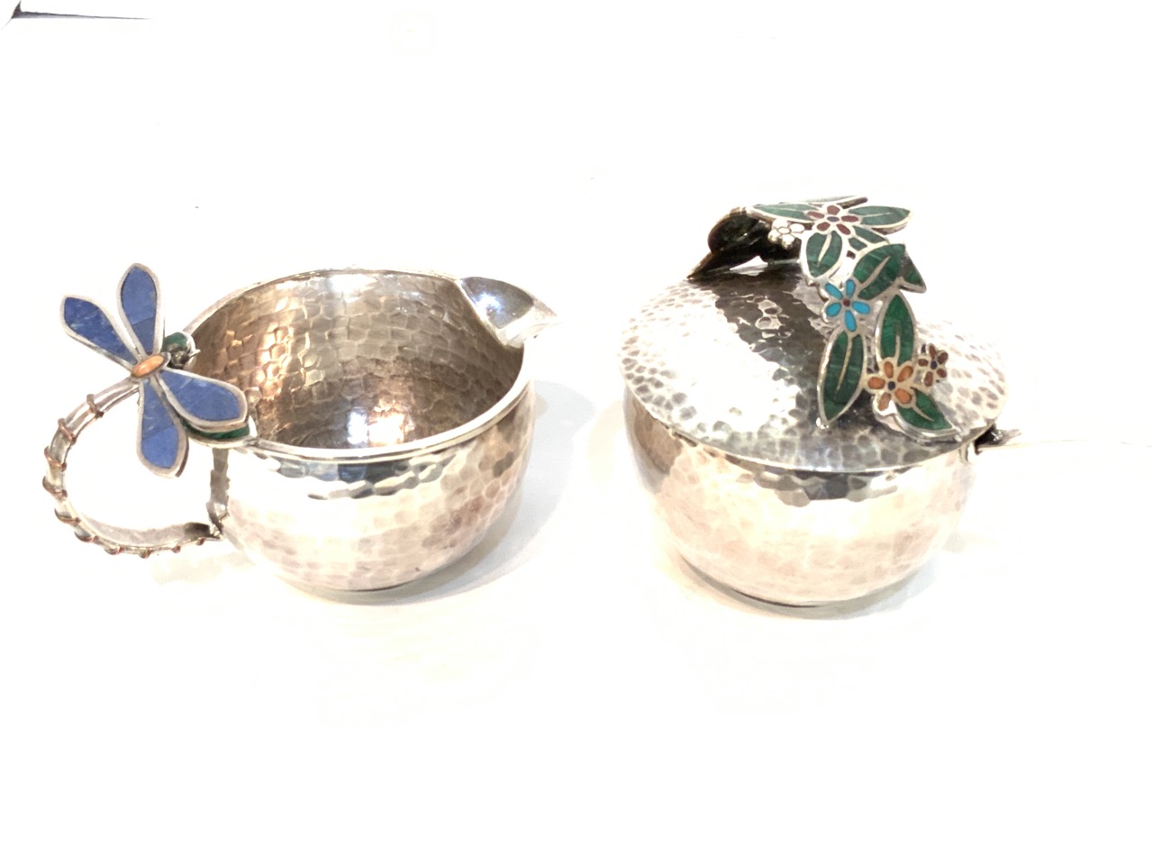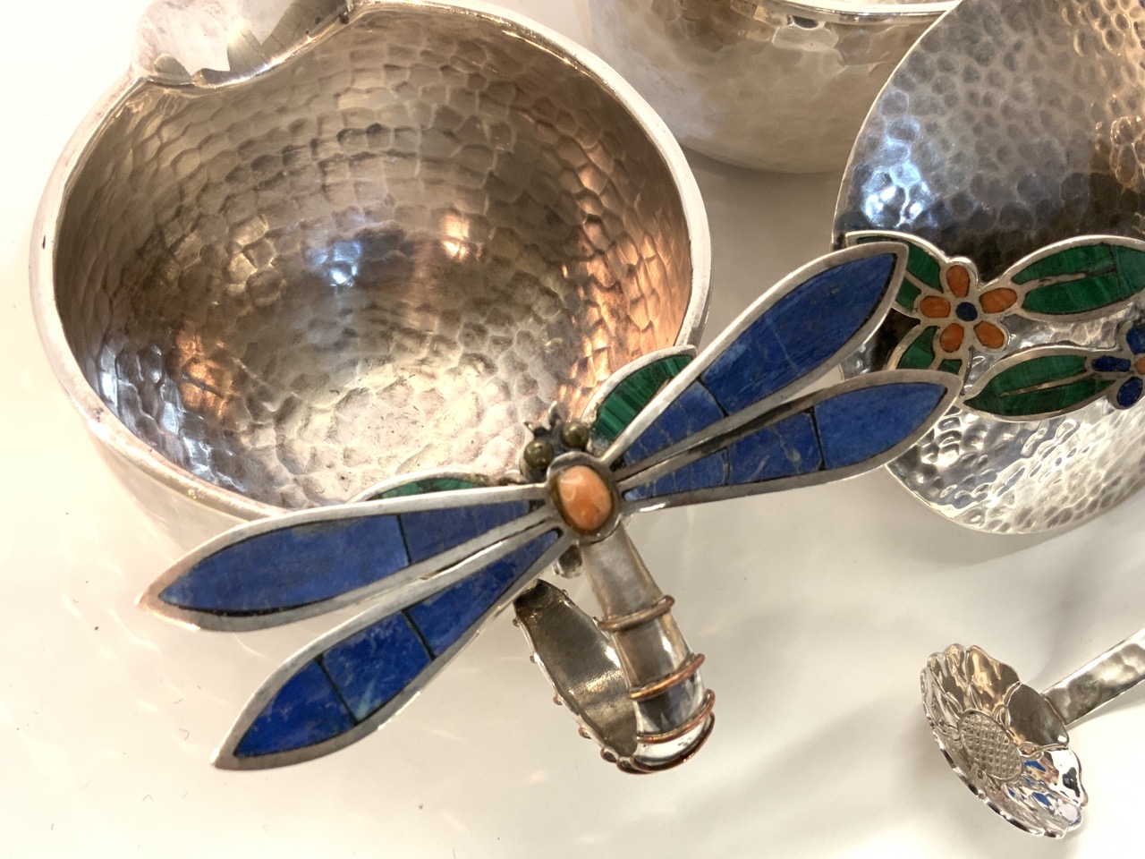 Emilia Castillo signed Mexican sterling silver sugar and creamer with ornate dragon fly and decorated floral handle. Fine hand hammered work with inset lapis, malachite and coral stones.