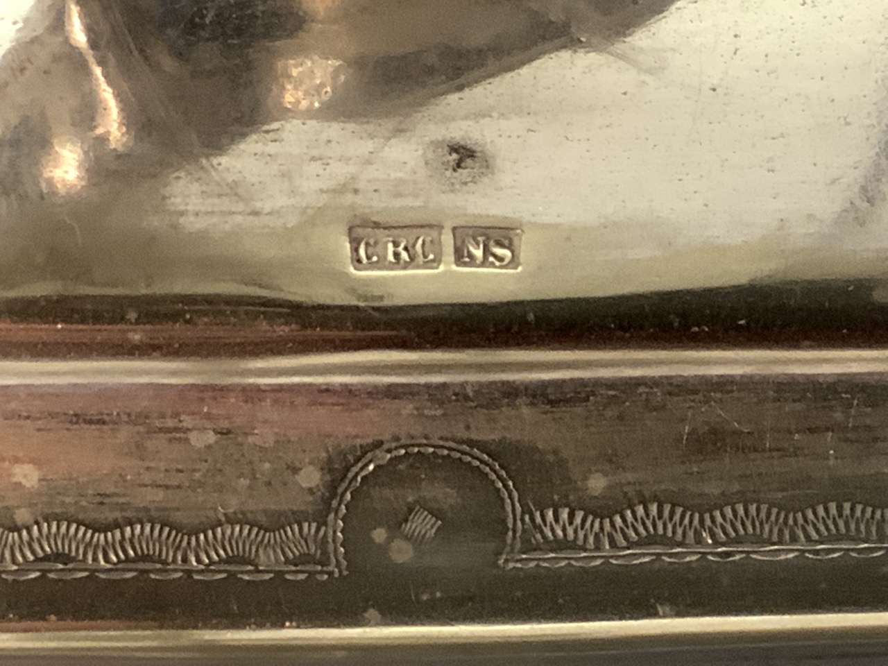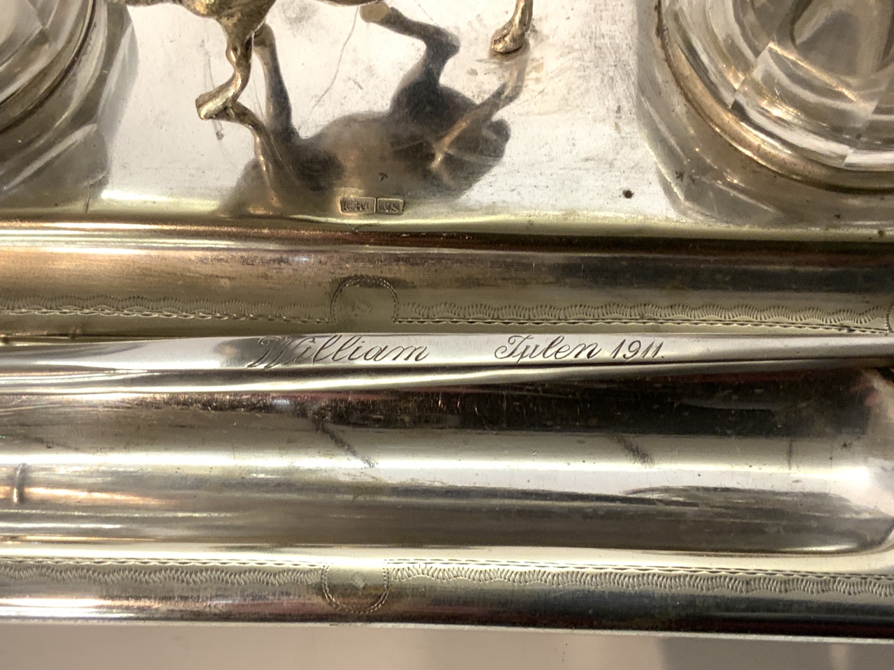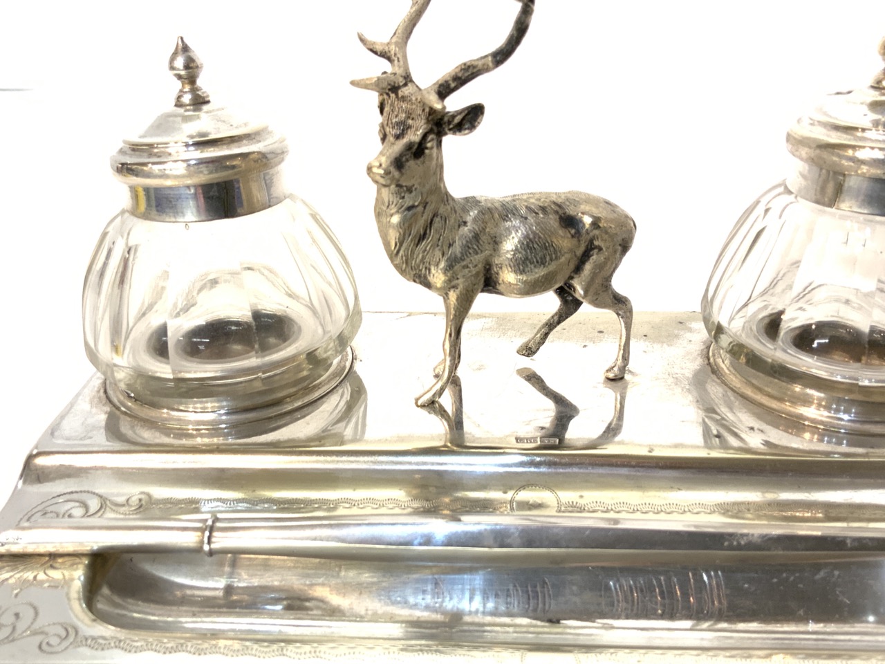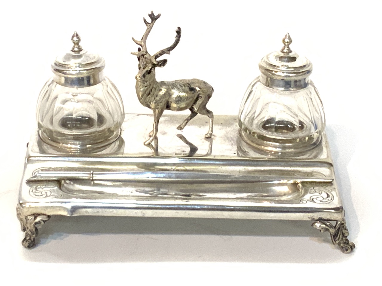 A Victorian ink stand with stag. Nickel silver with maker's mark C.R.C.