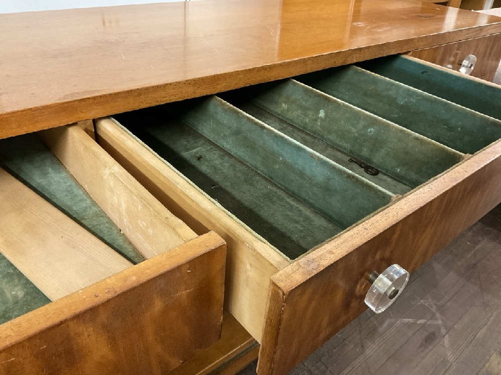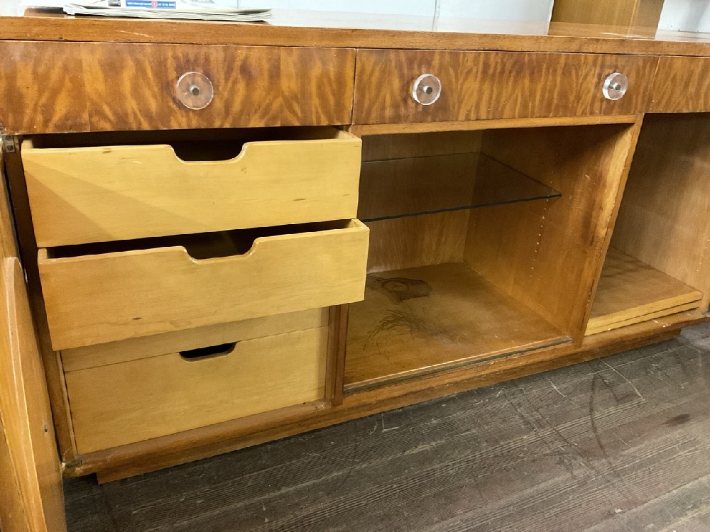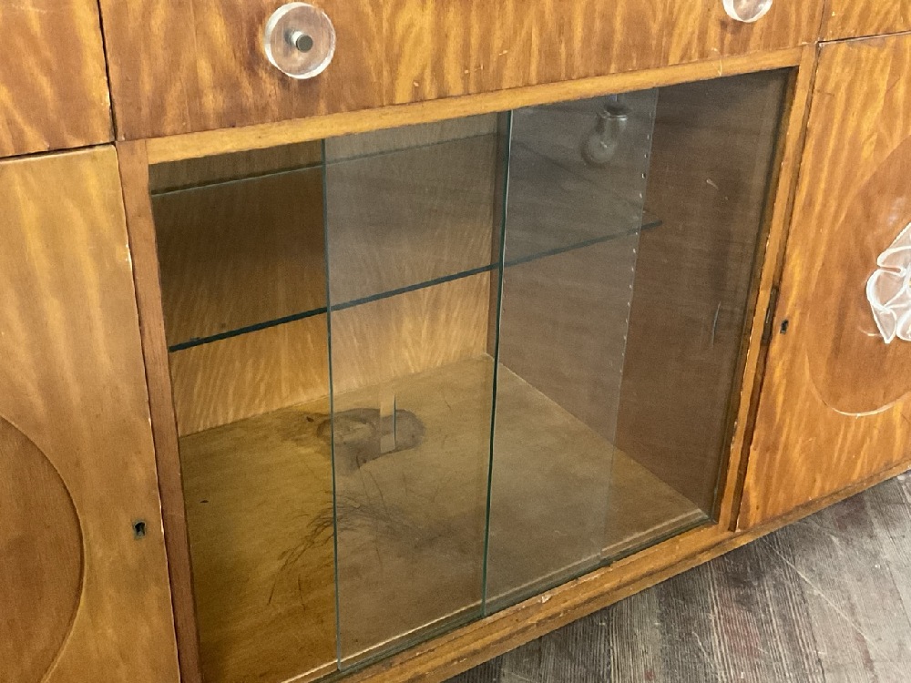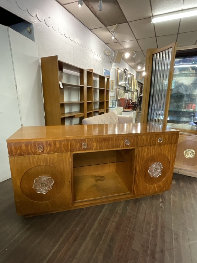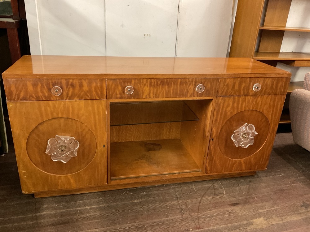 Early Mid Century Modern 1940's Lorin Jackson Designed Sideboard Cabinet. Sliding glass doors at center with two blind doors on each side with oversized carved lucite floral pulls. Lined cutlery drawers. Overall good. Wear noted. Please see photograph preview.