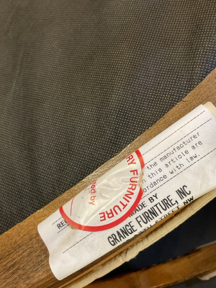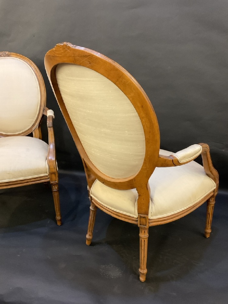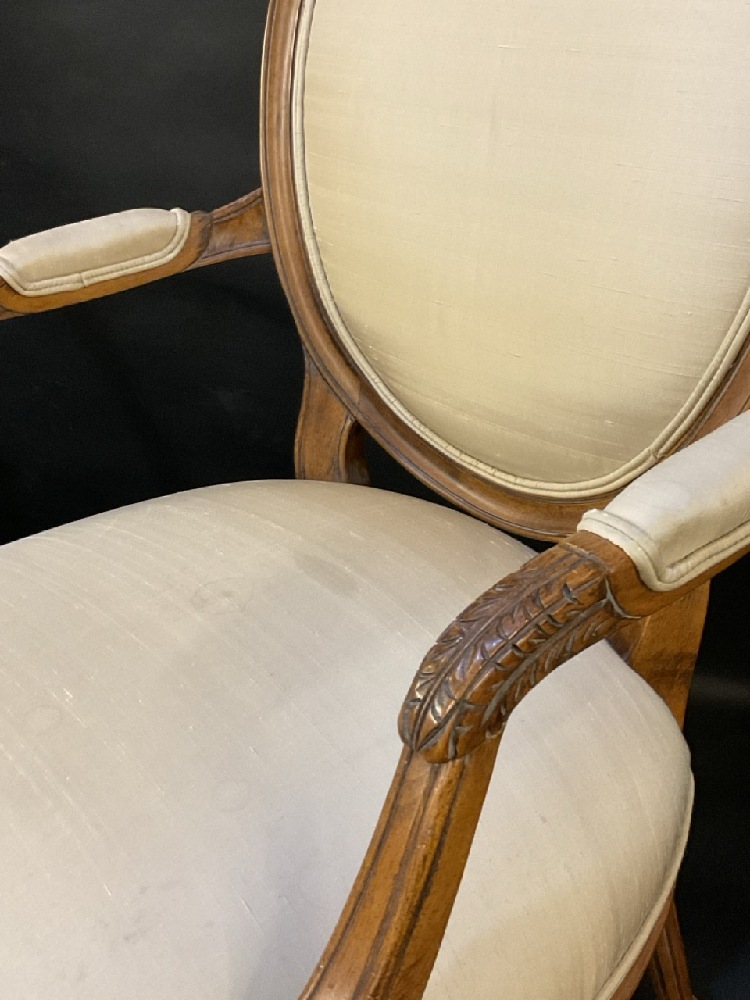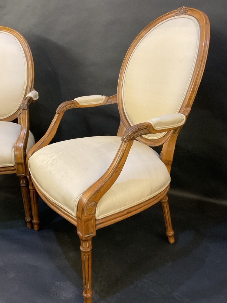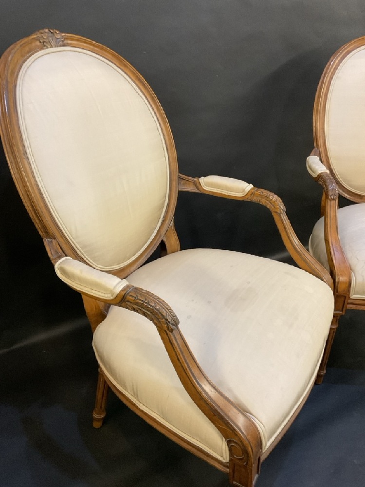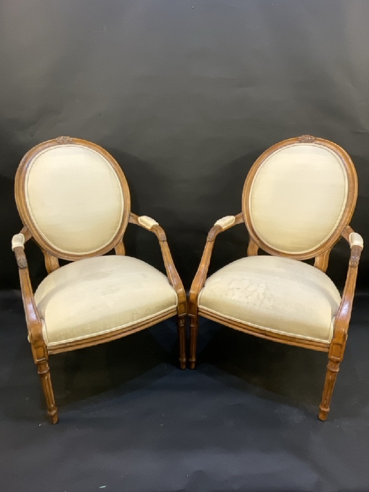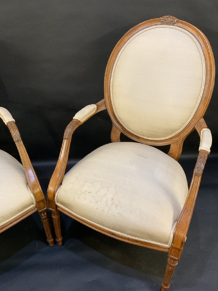 Pair of Armchairs Louis XV Style by Grange Furniture. Chair frames and wood in excellent sturdy condition. Seating upholstery is stained and needs replacement or cleaning..
