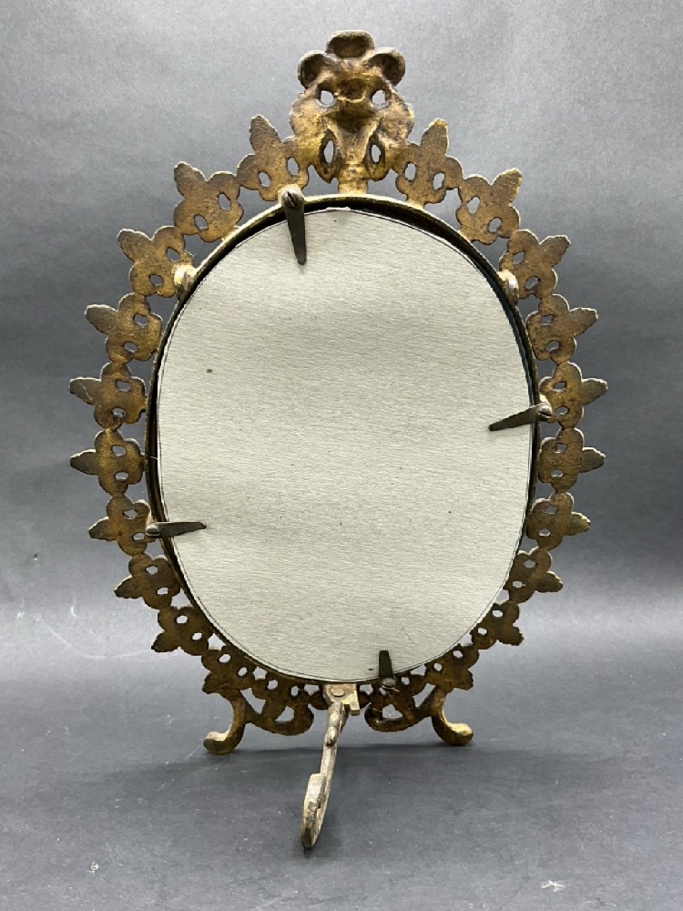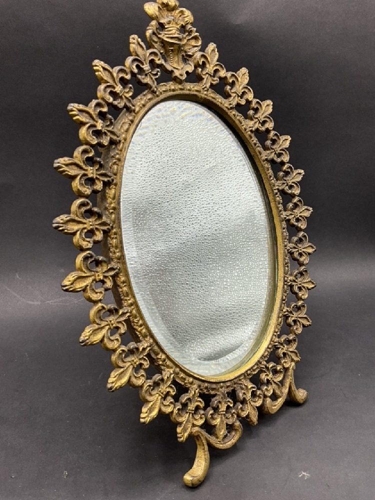 Antique Fleur De Lis Easel Back Cast Iron Mirror w/ Solid Gilt.