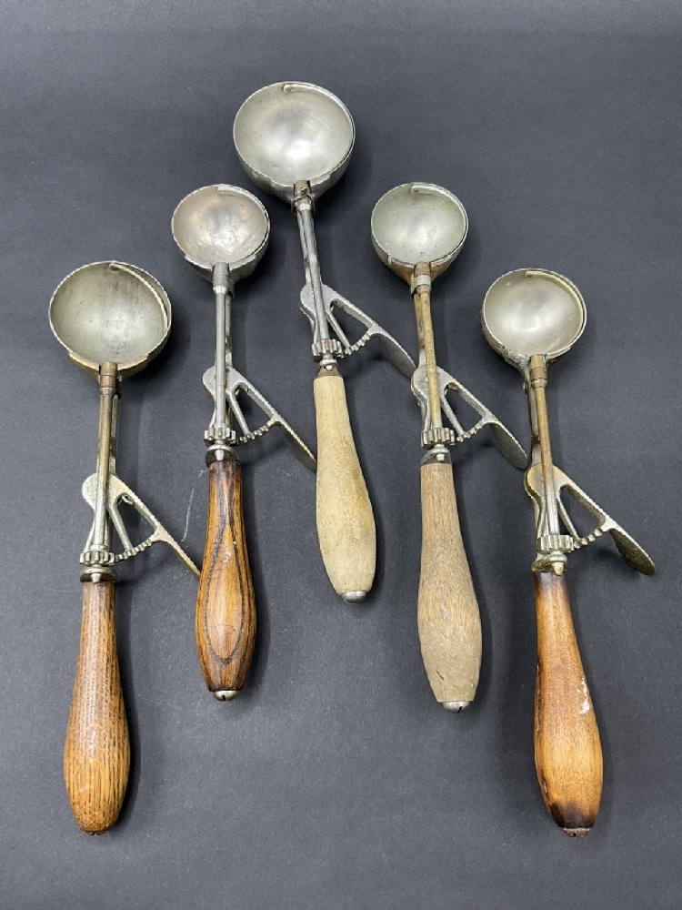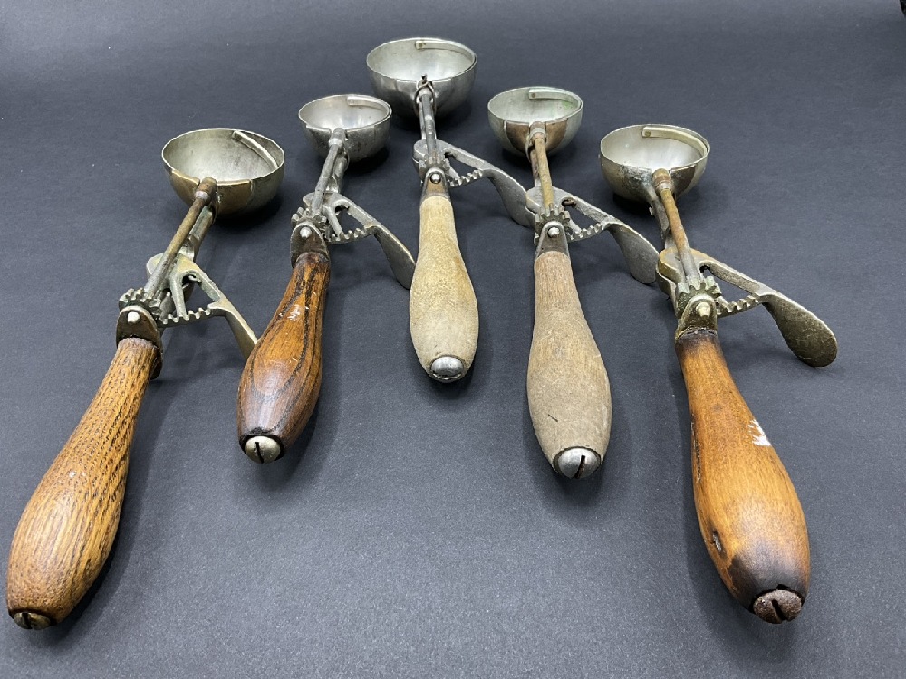 Five (5) Antique Ice Cream Scoops - Three signed Gilchrist No. 31.